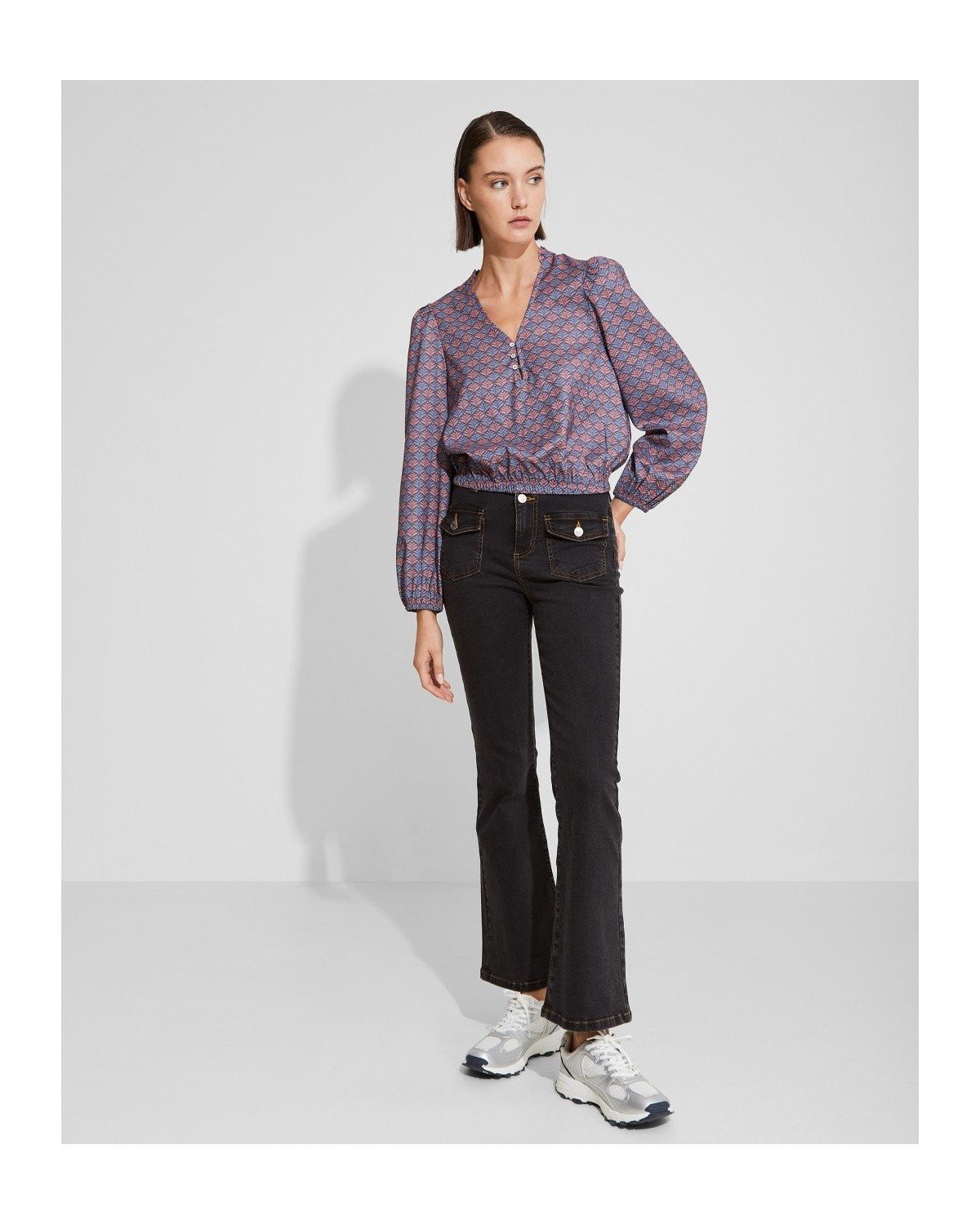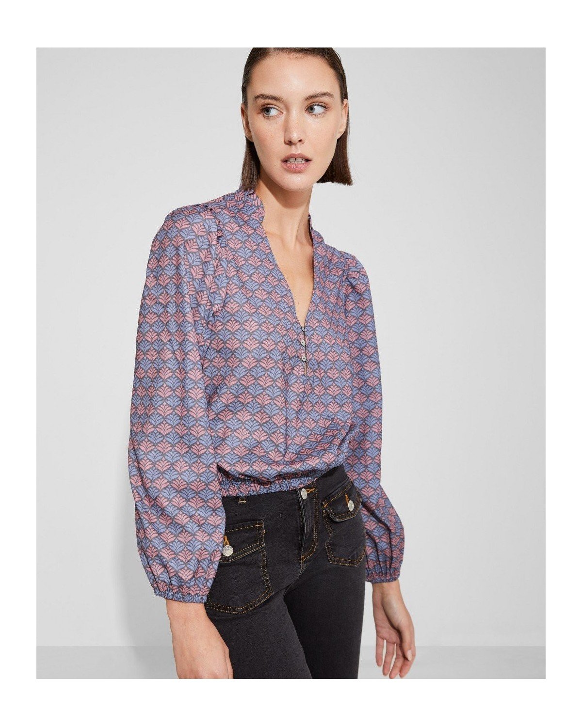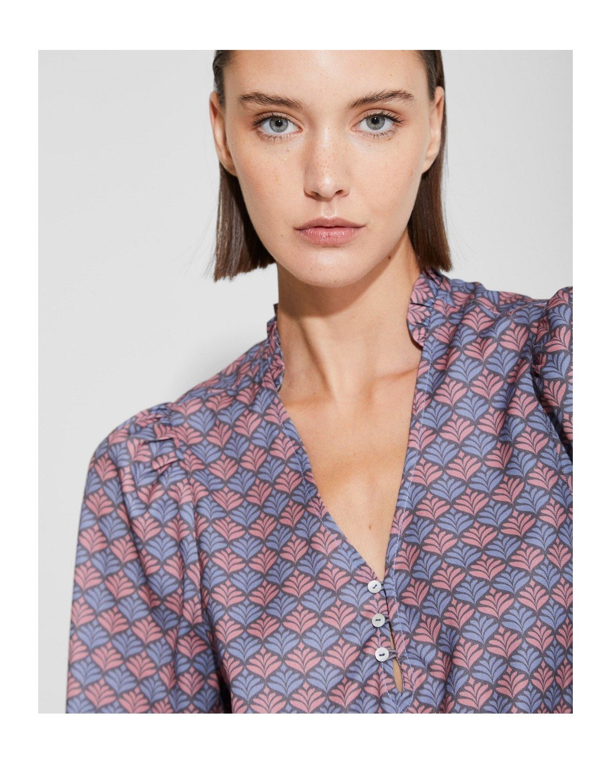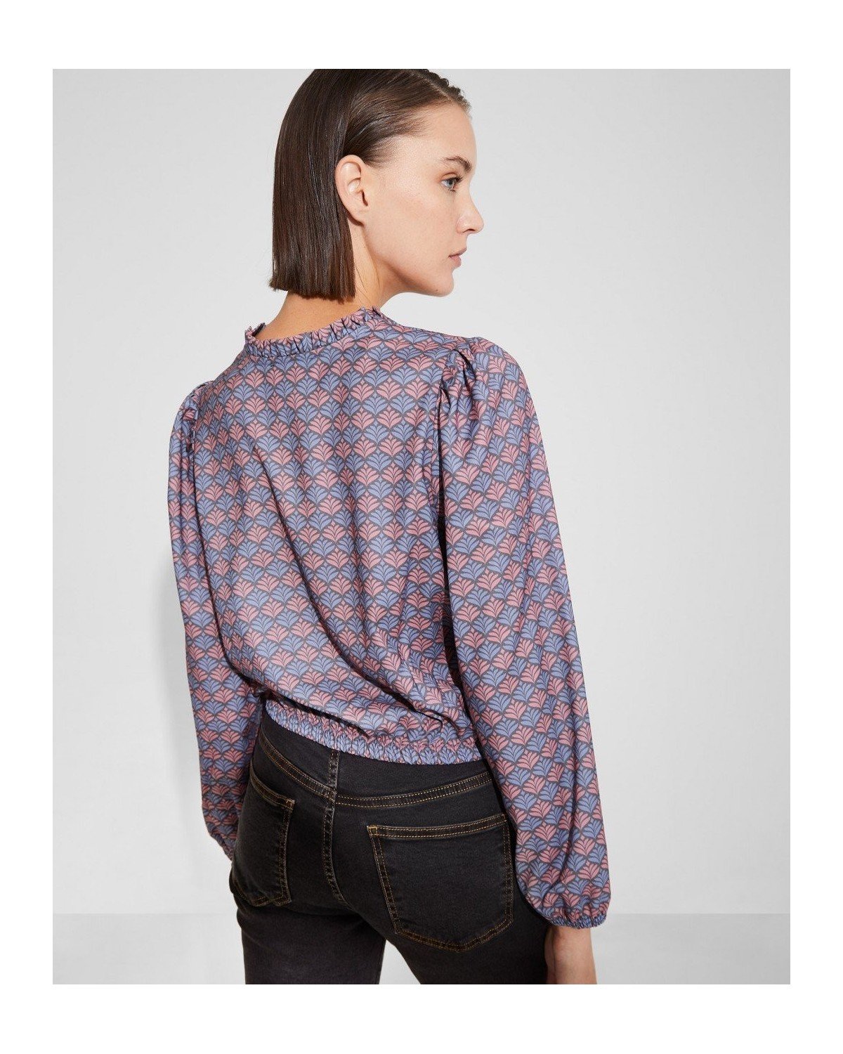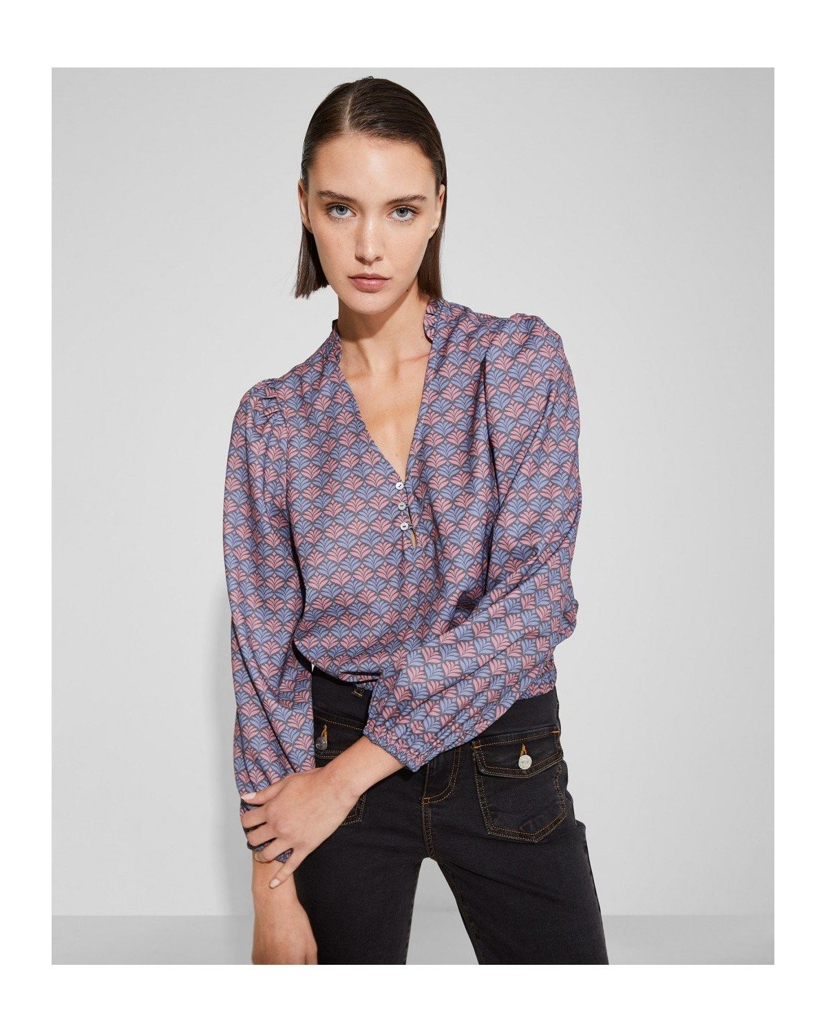 Blusa estampada con manga larga abombada acabada en fruncido y cuello mao acabado en V