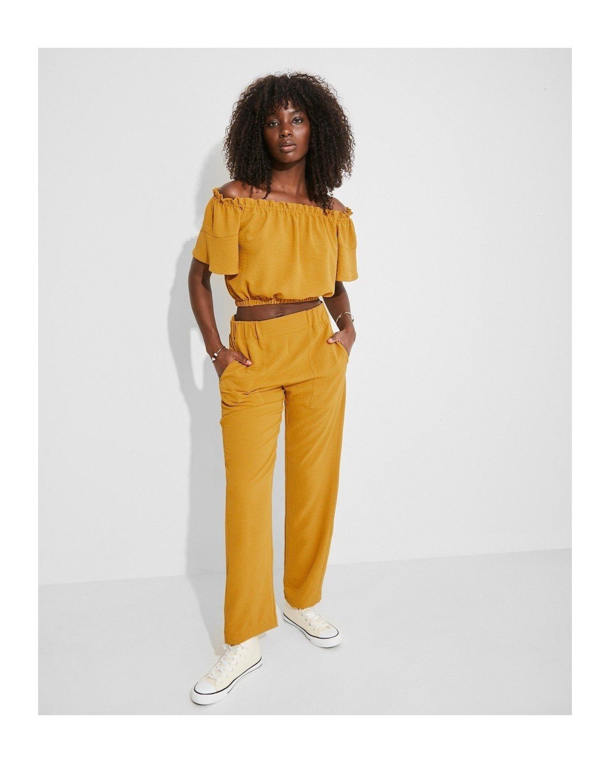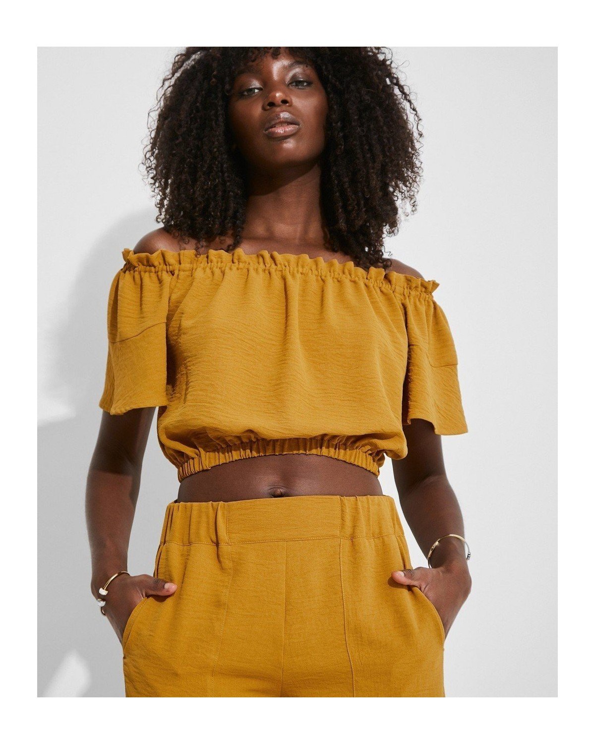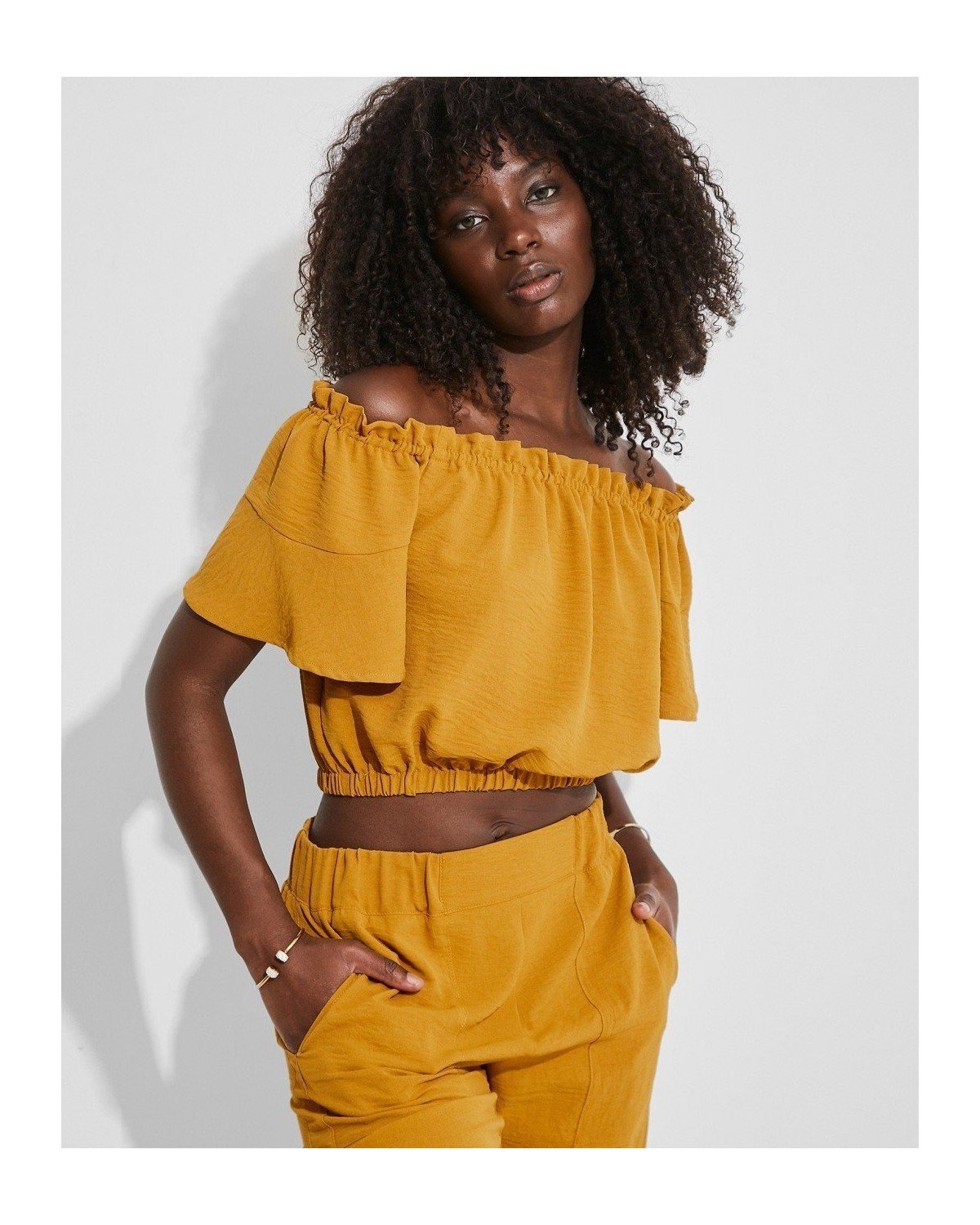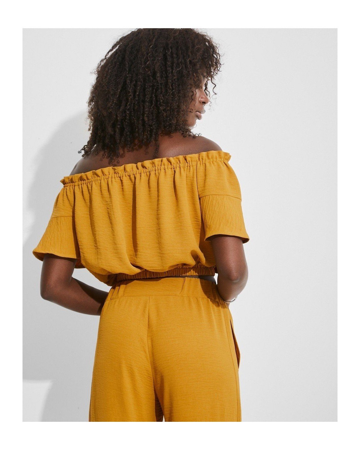 Blusa de cuello barco fruncido, manga corta y fruncido en bajo
