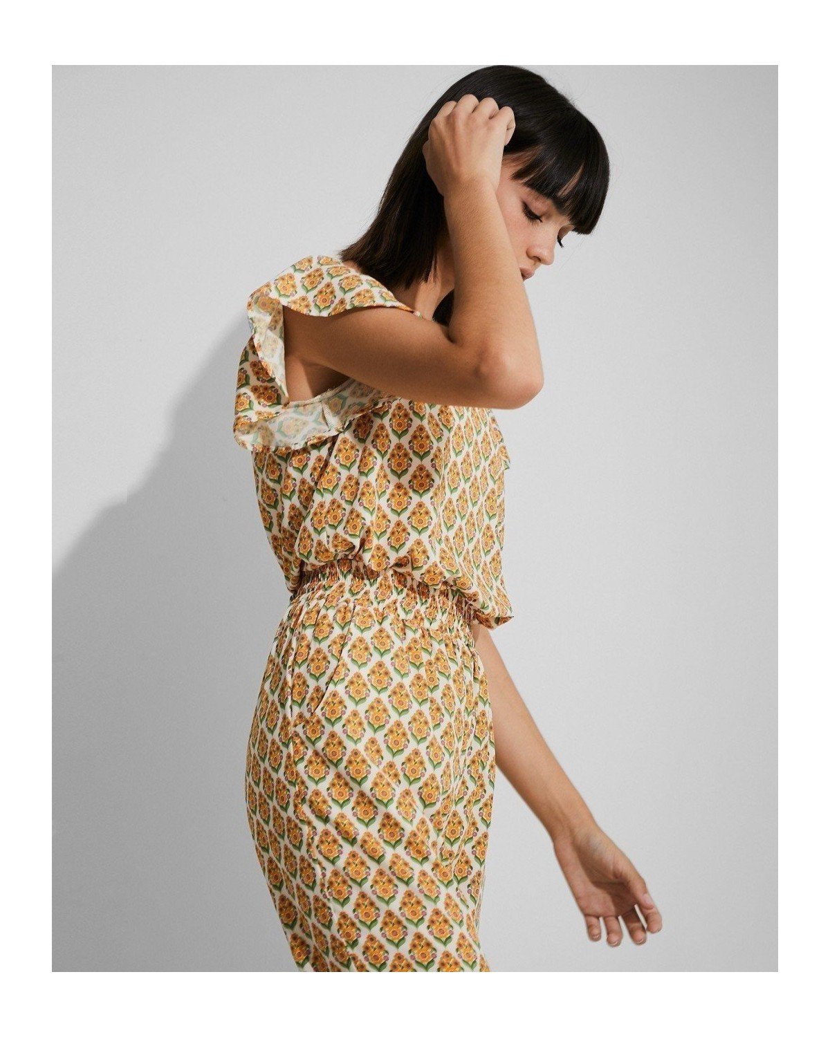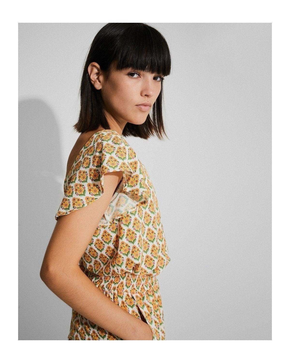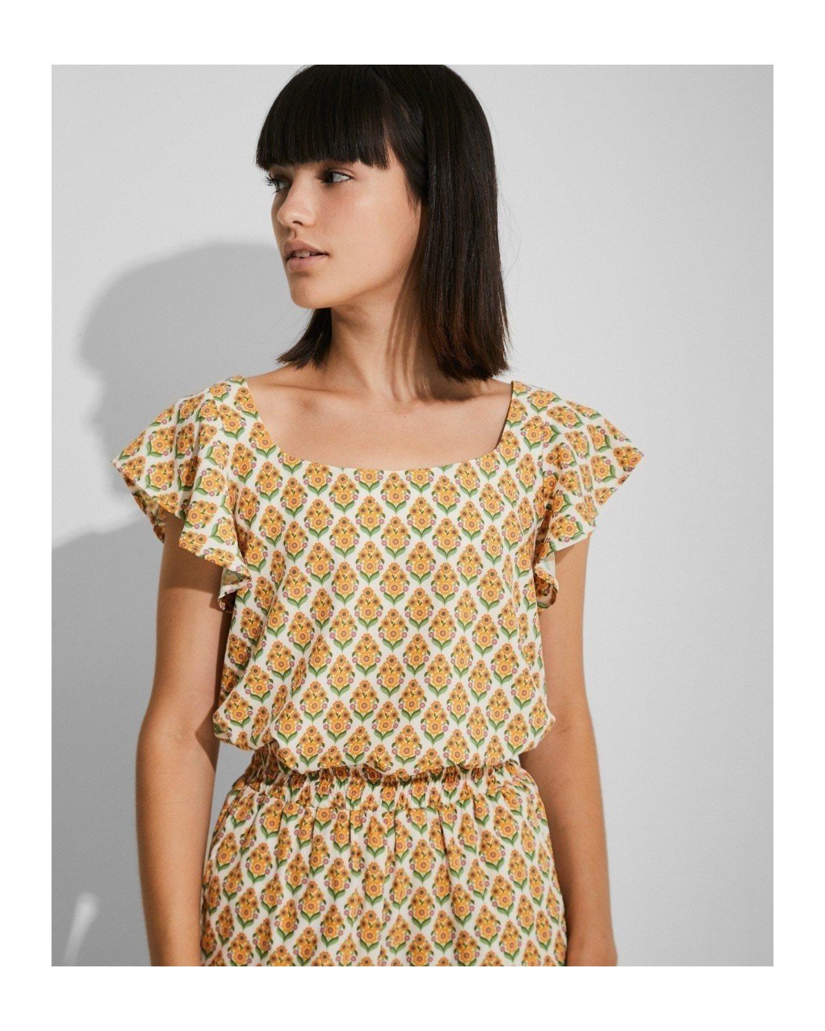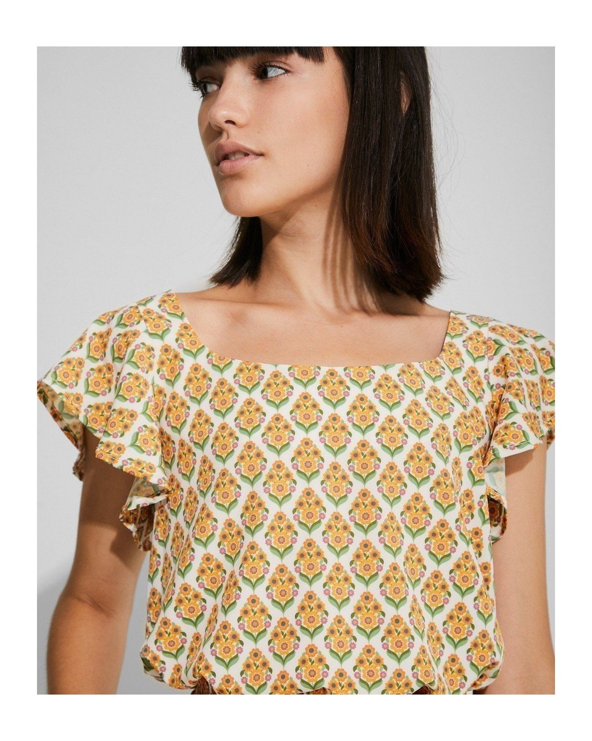 Camisa de estampado floral con volantes en mangas y cuello cuadrado