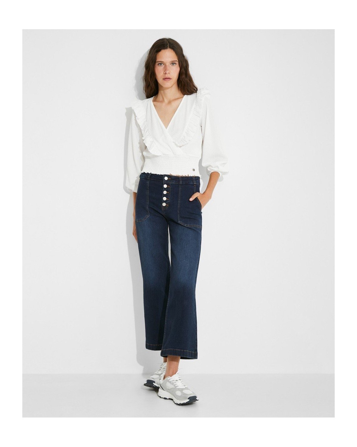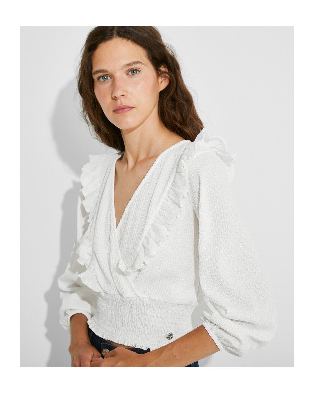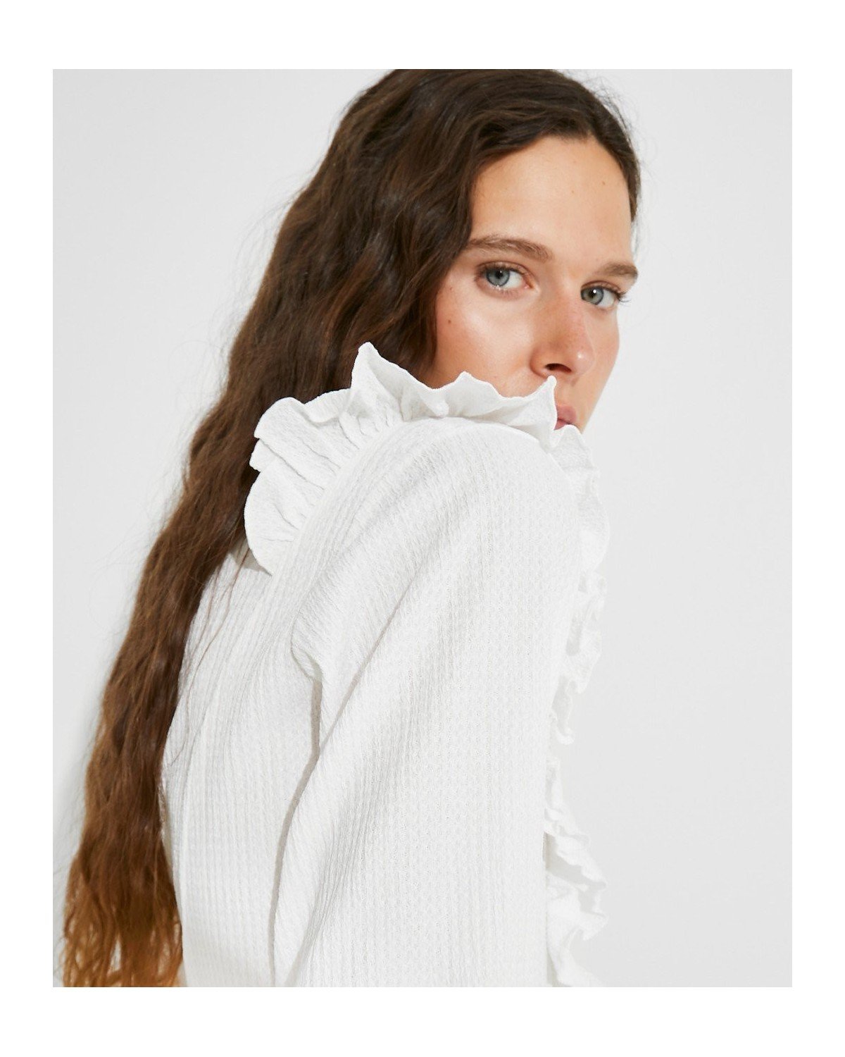 Camiseta de punto canalé con manga tres cuarto abombada, cuello pico con detalle frontal de volante y fruncido en bajo