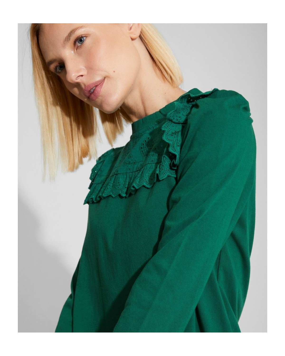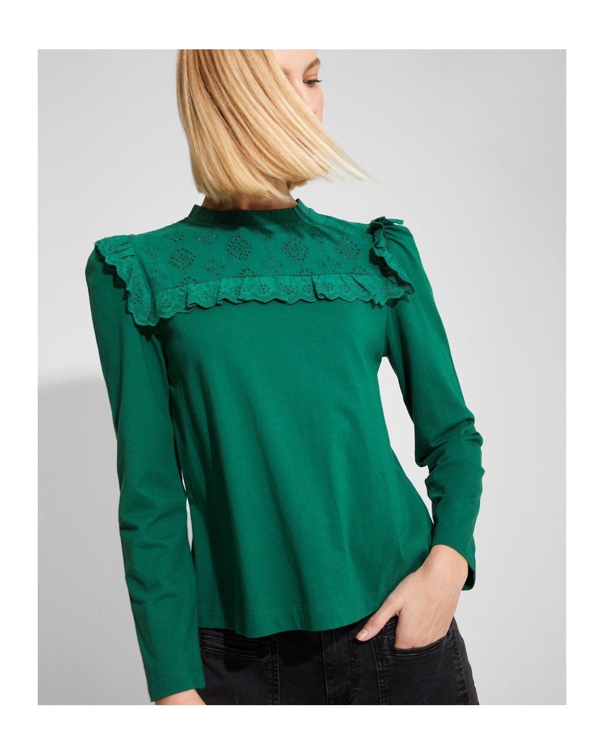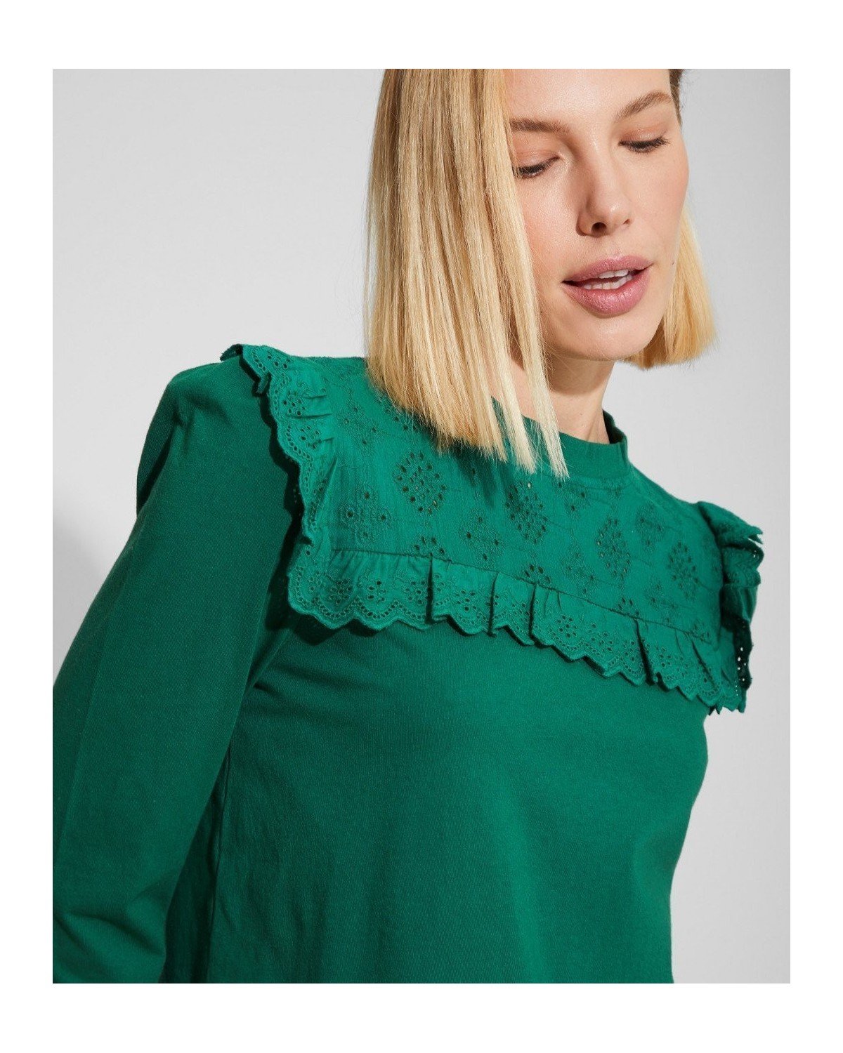 Camiseta con bordado suizo en parte superior, manga larga y cuello redondo cerrado