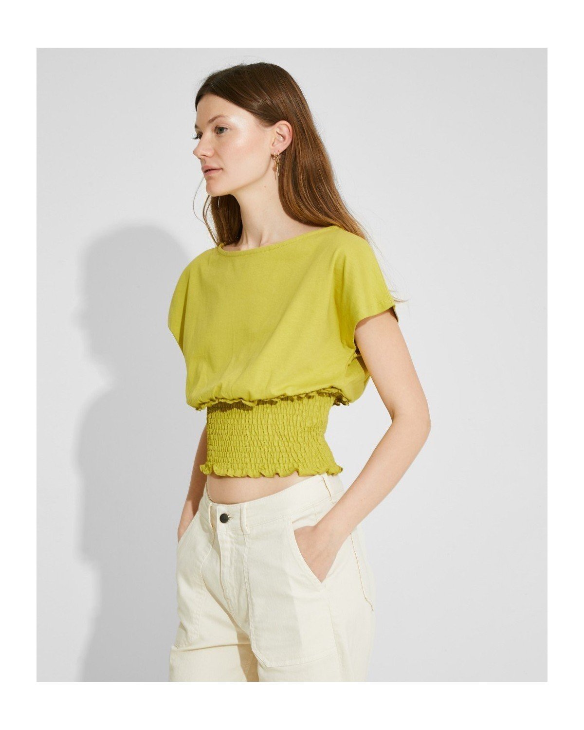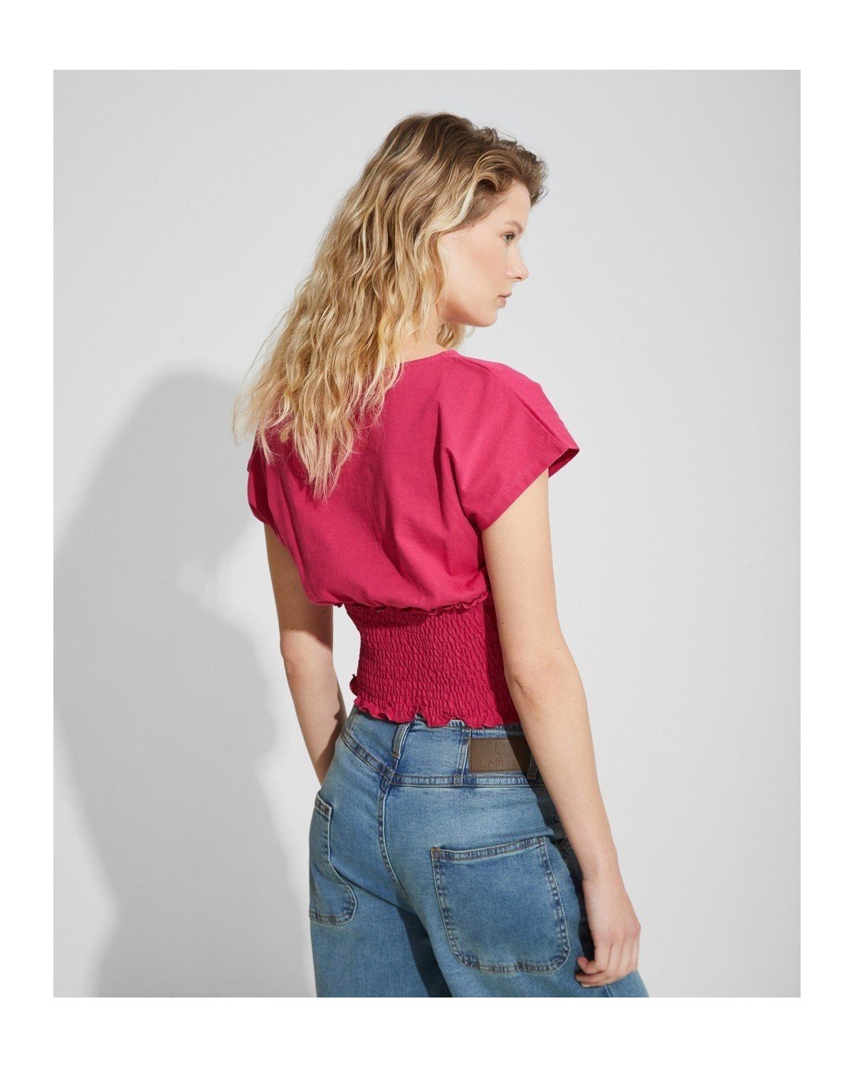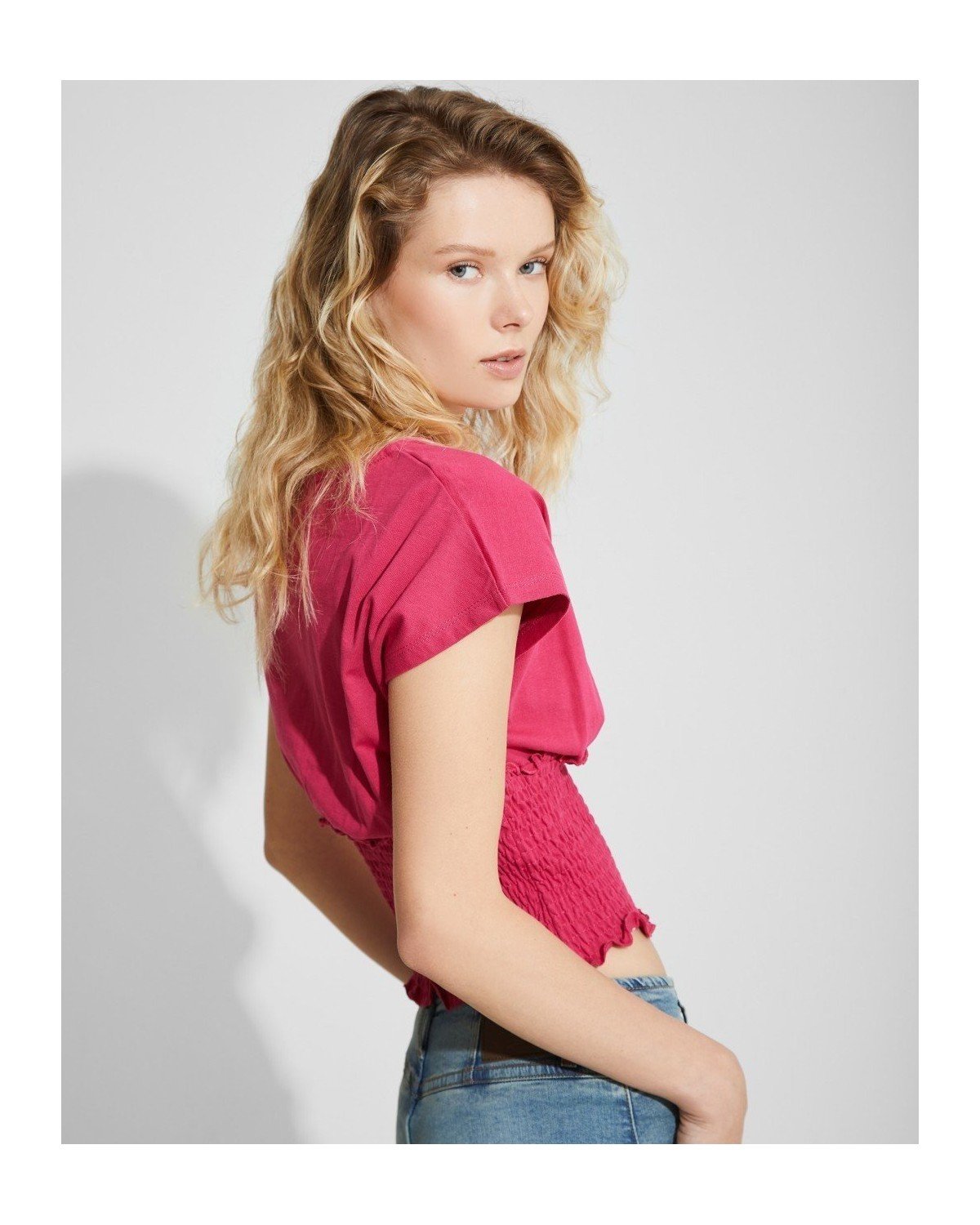 Camiseta con fruncido en bajo, manga corta y cuello redondo cerrado