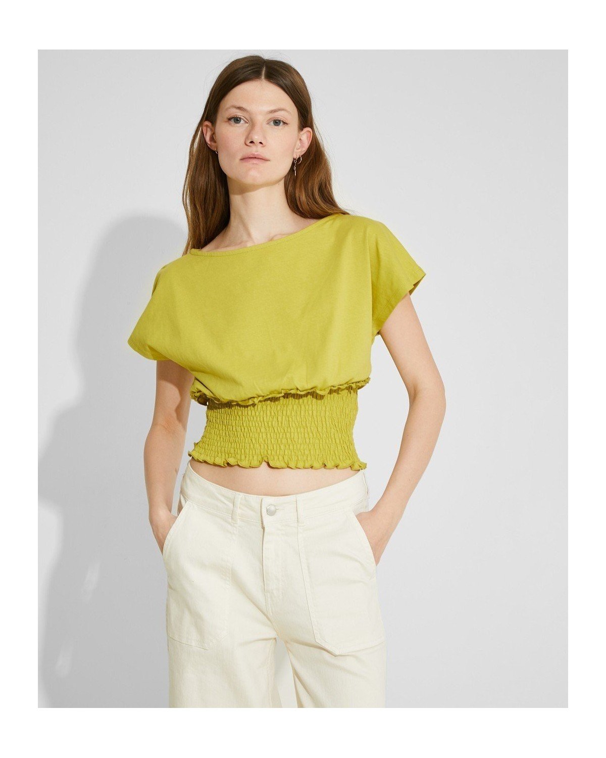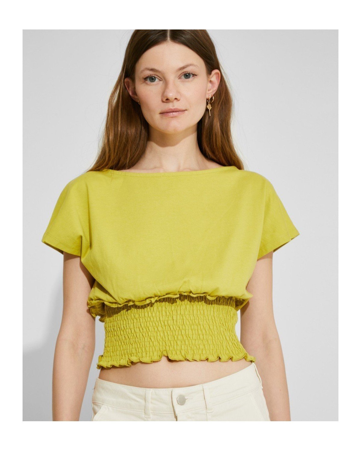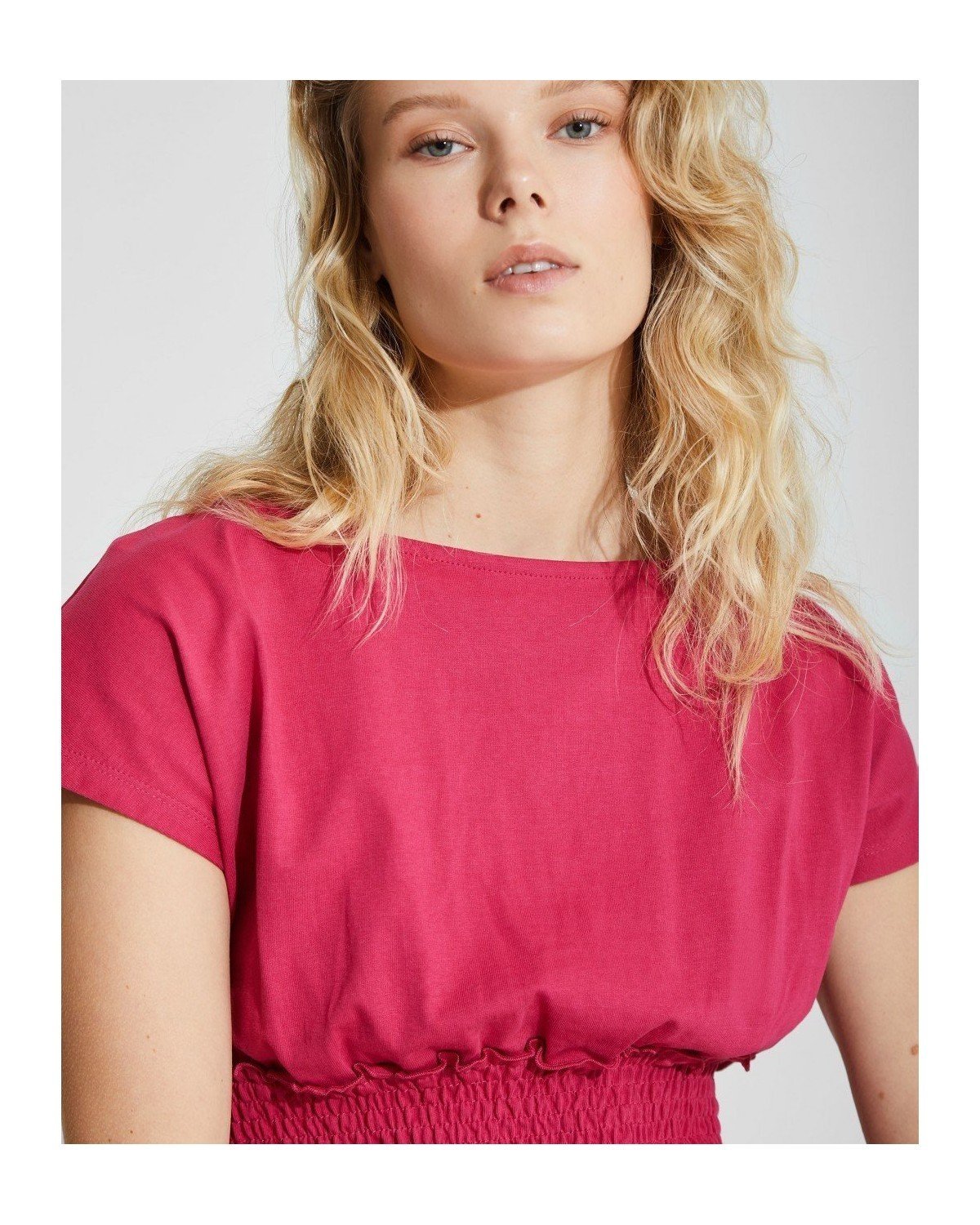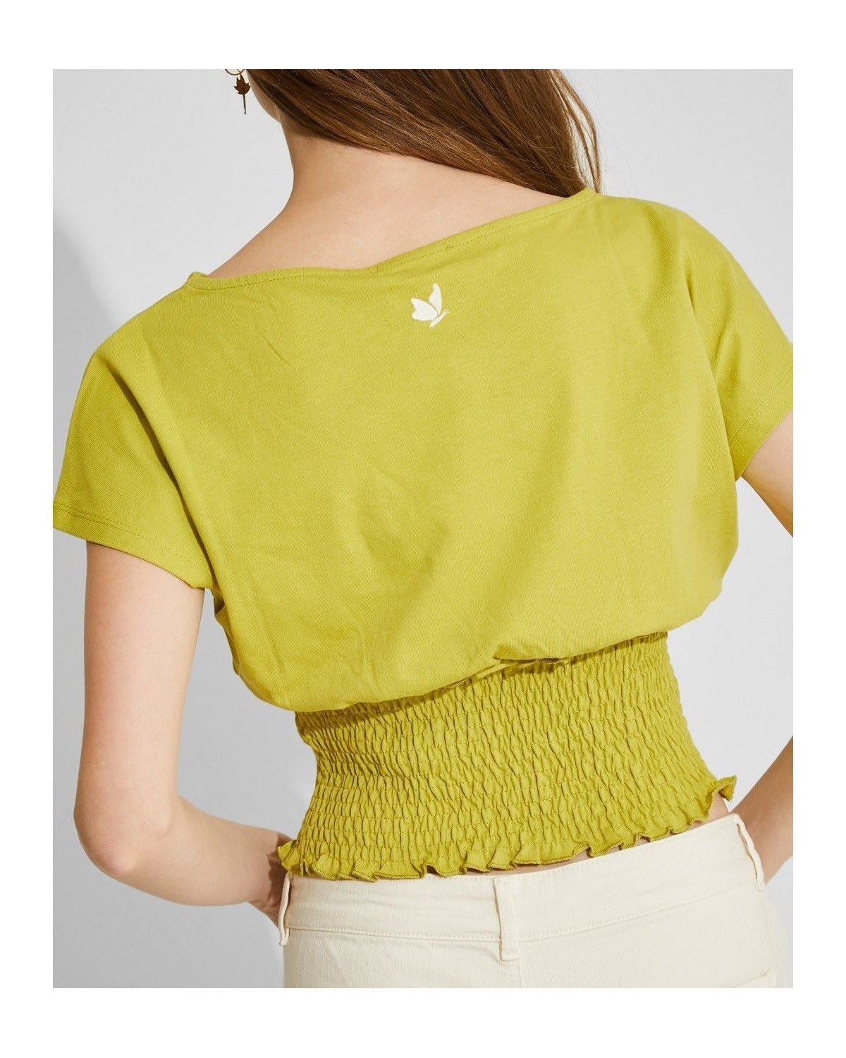 Camiseta con fruncido en bajo, manga corta y cuello redondo cerrado
