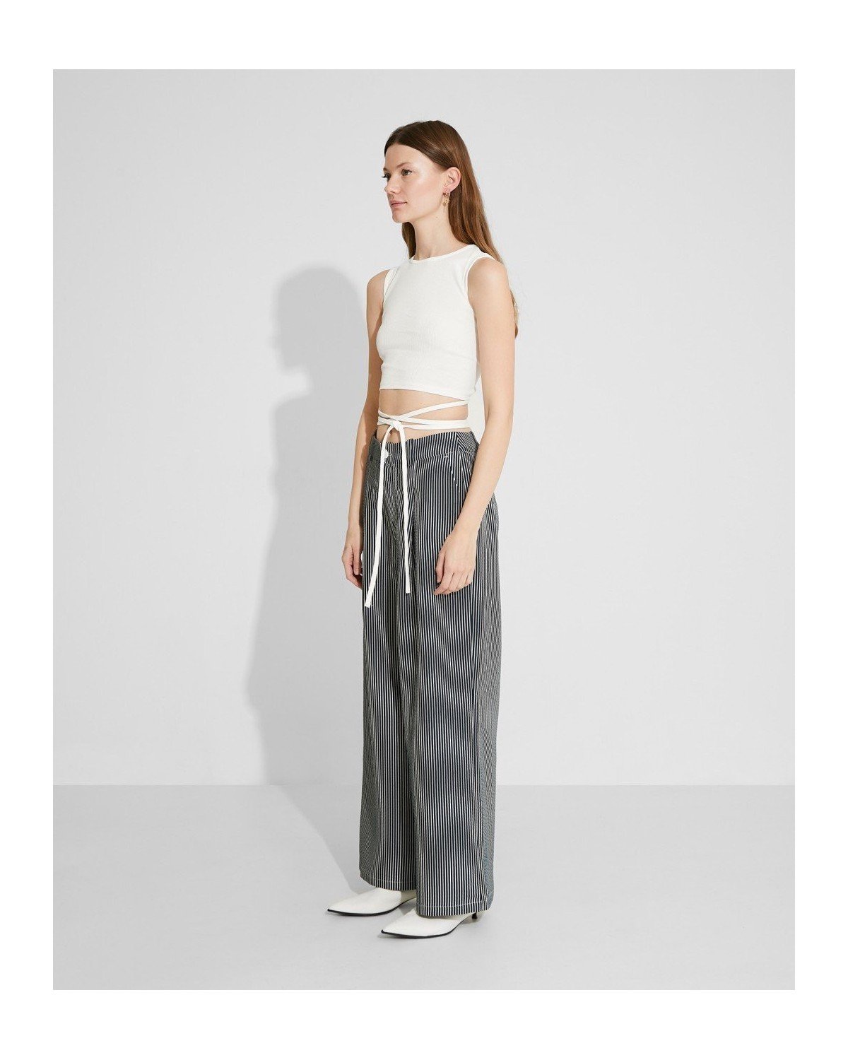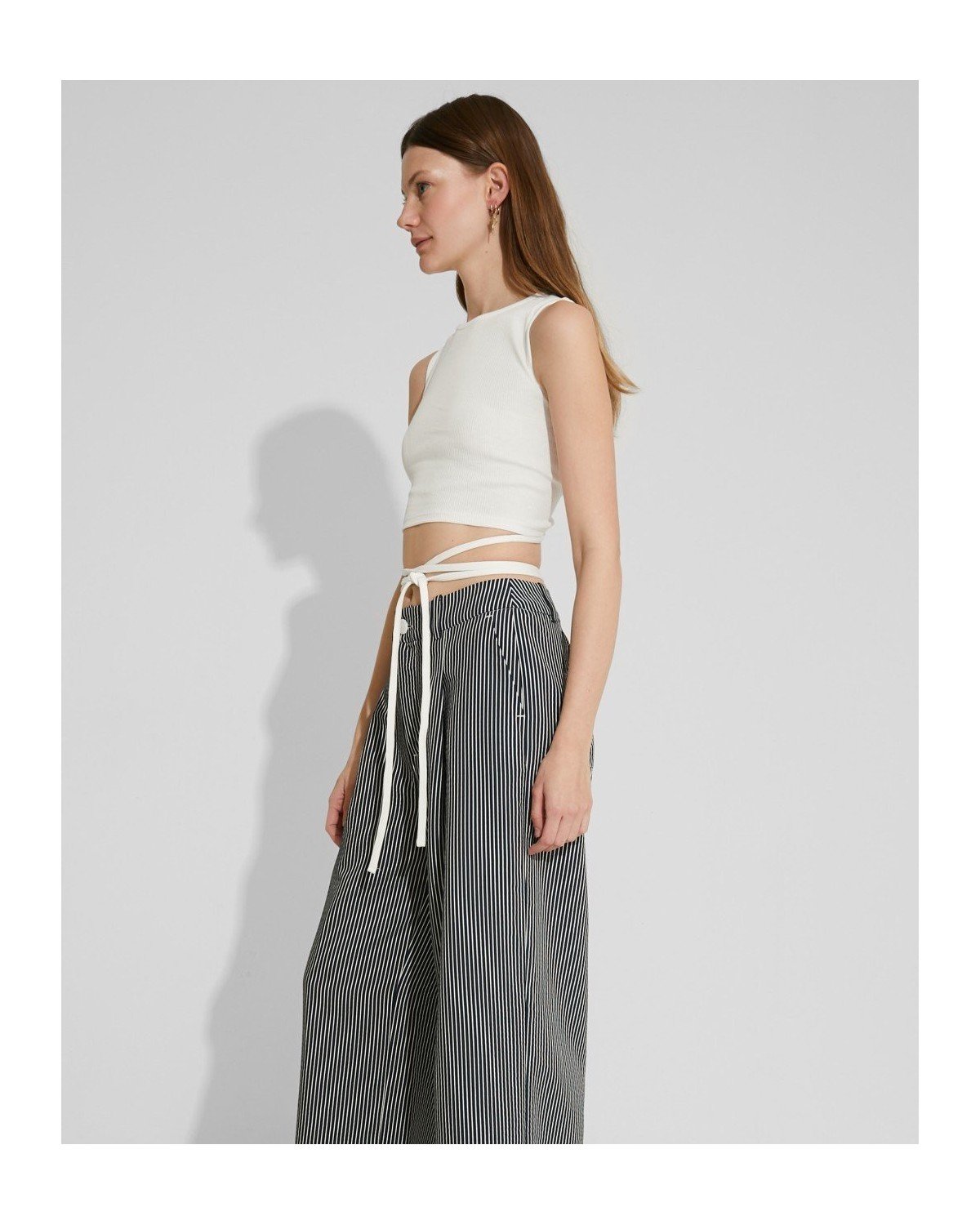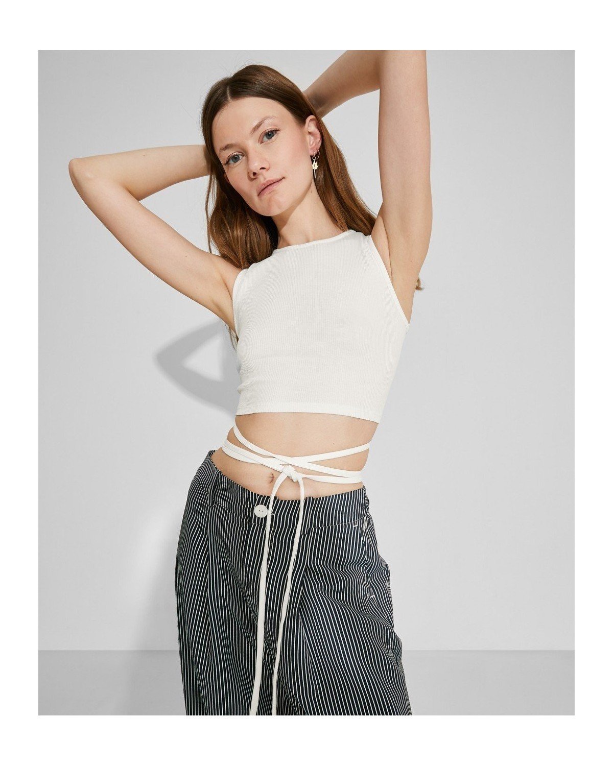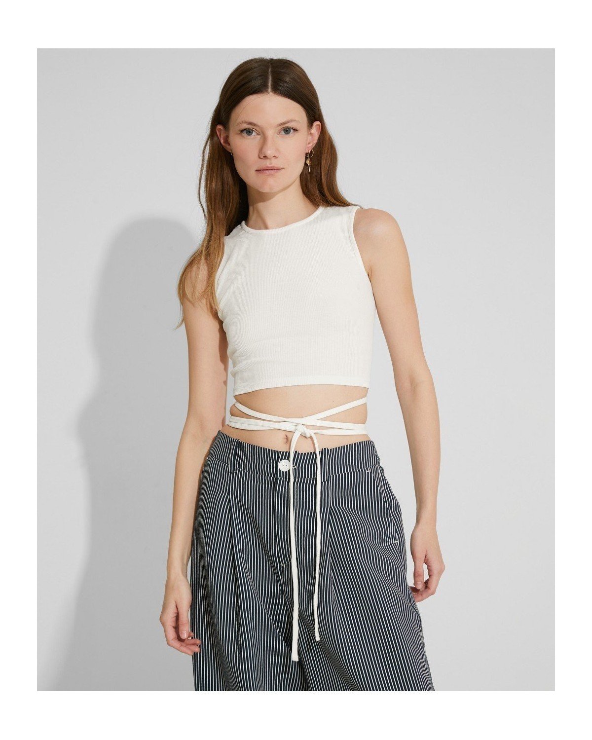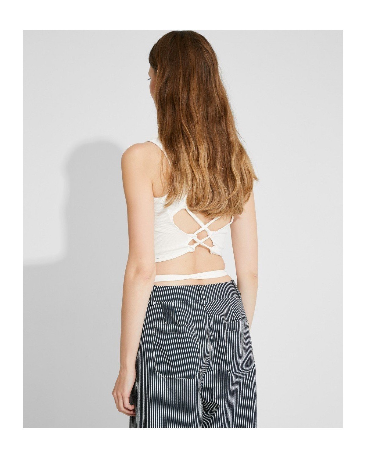 Crop top de punto canalé de tirantes y cuello redondo cerrado. Escote en espalda cruzado acabado en cordón