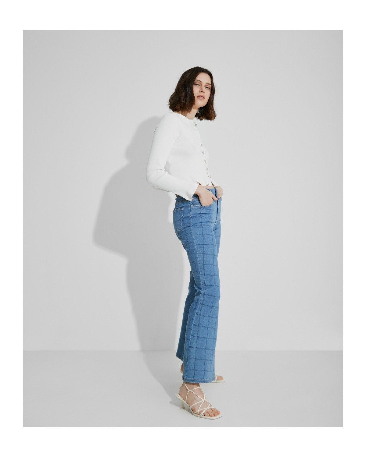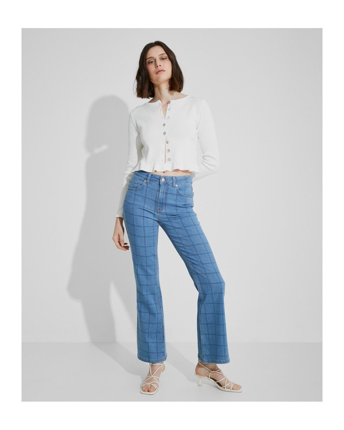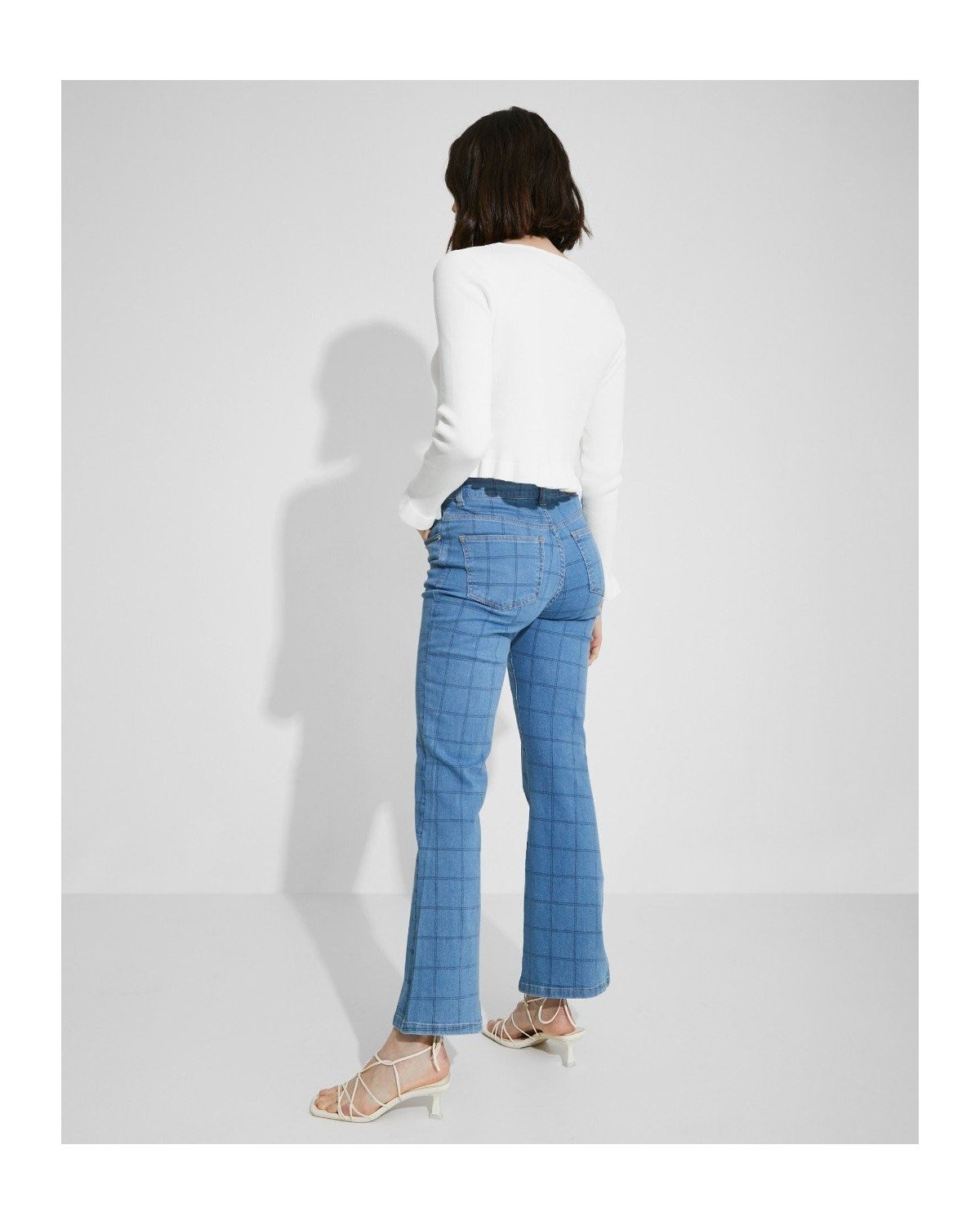Pantalón denim de rayas. Tiro medio. Bajo flare