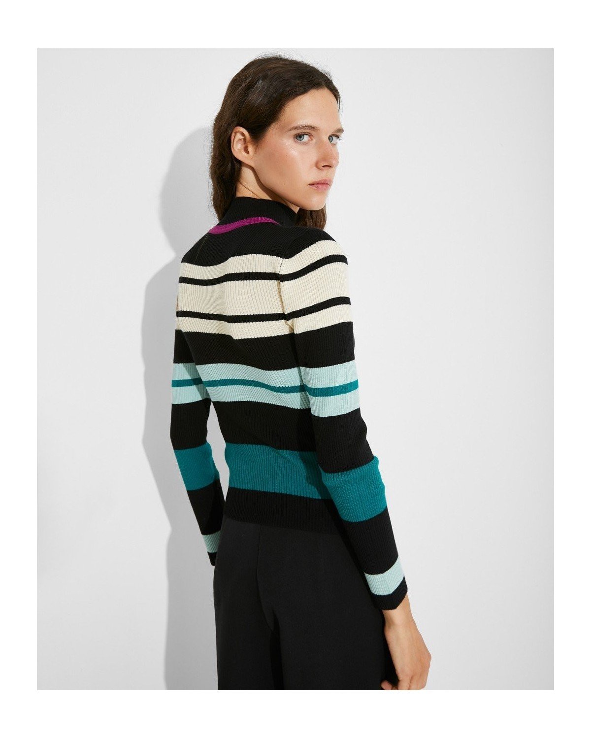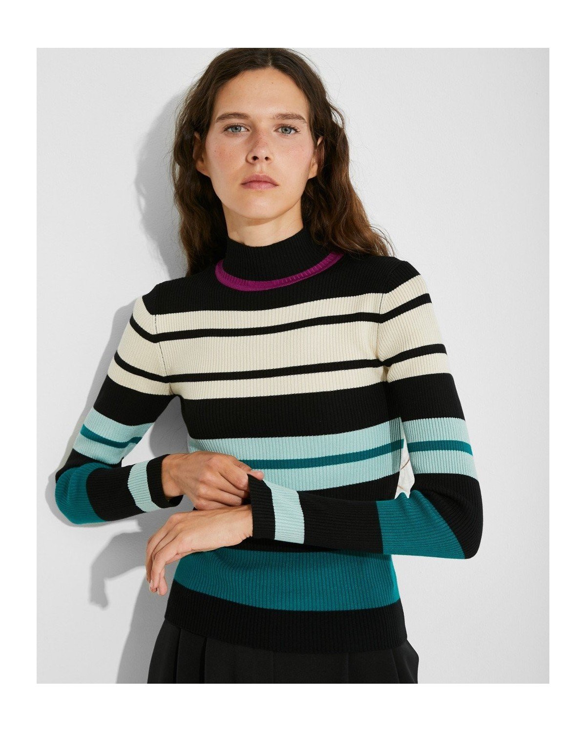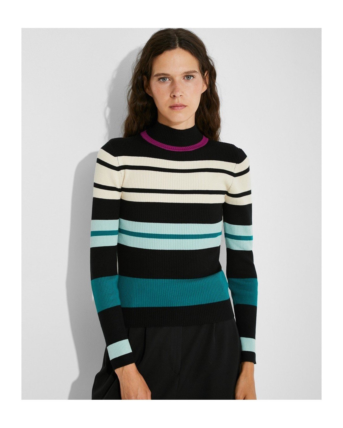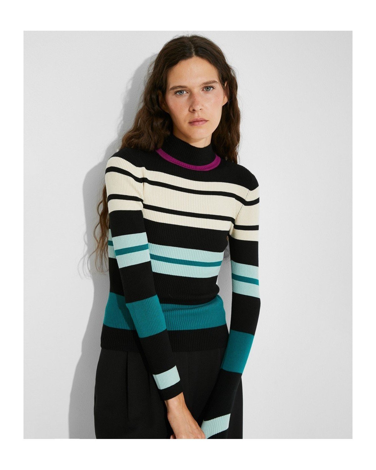 Jersey ajustado de punto canalé y rayas desiguales. Cuello alto