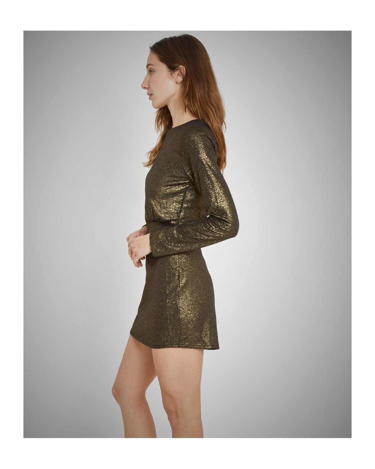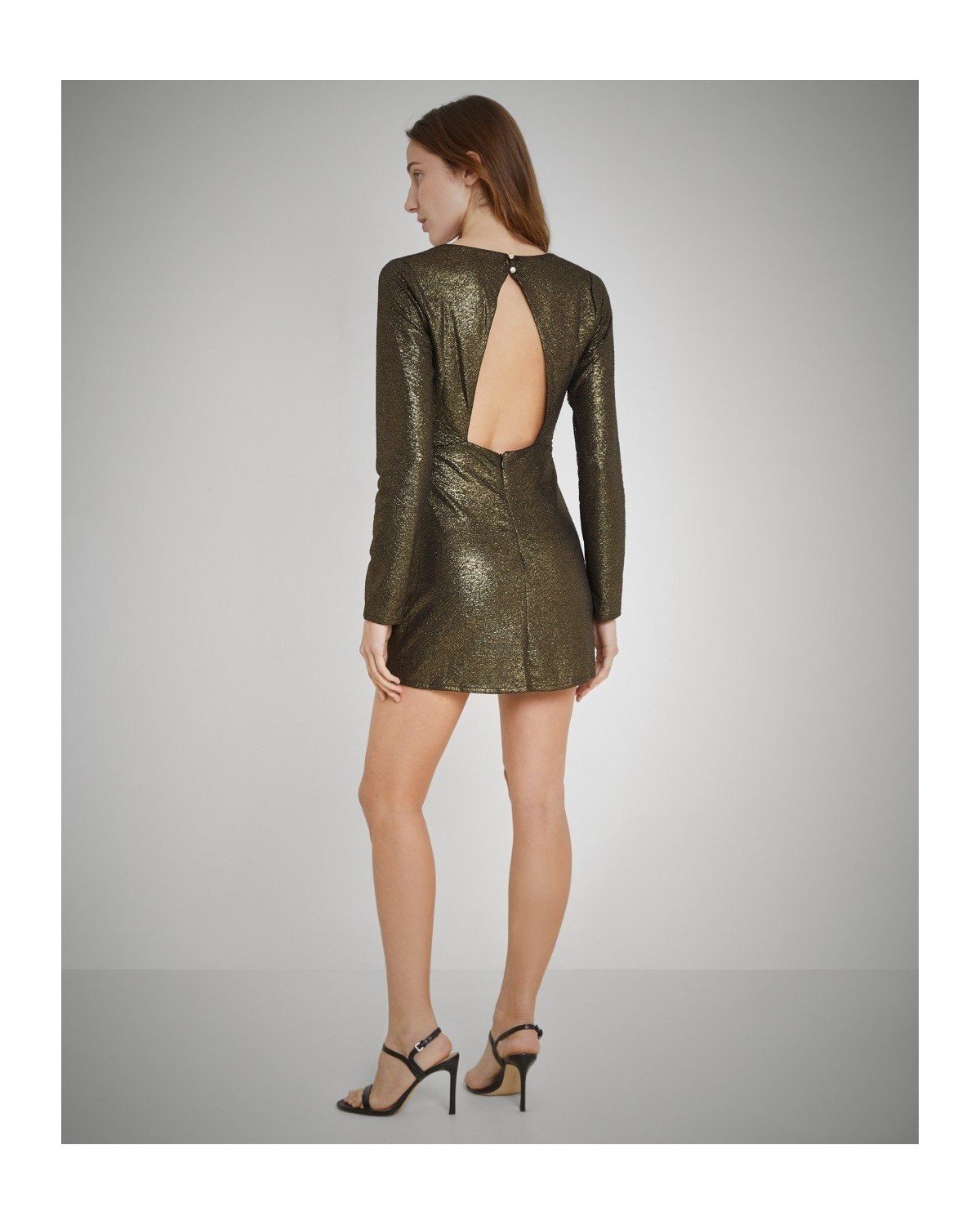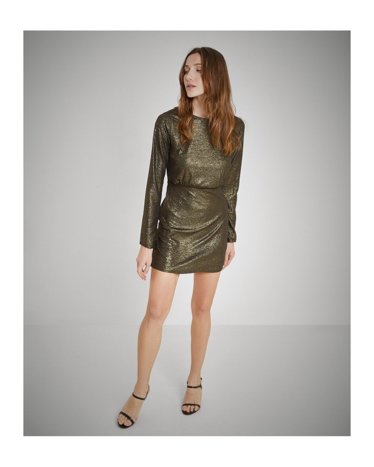 Vestido mini dorado brillante, de manga larga con hombreras, cruzado en cintura y escote en parte trasera