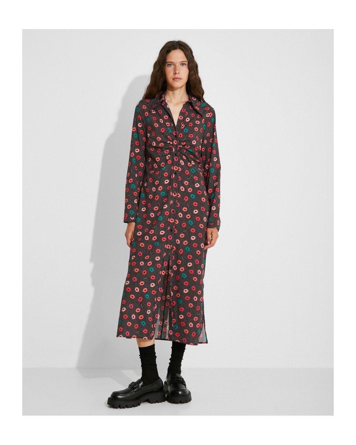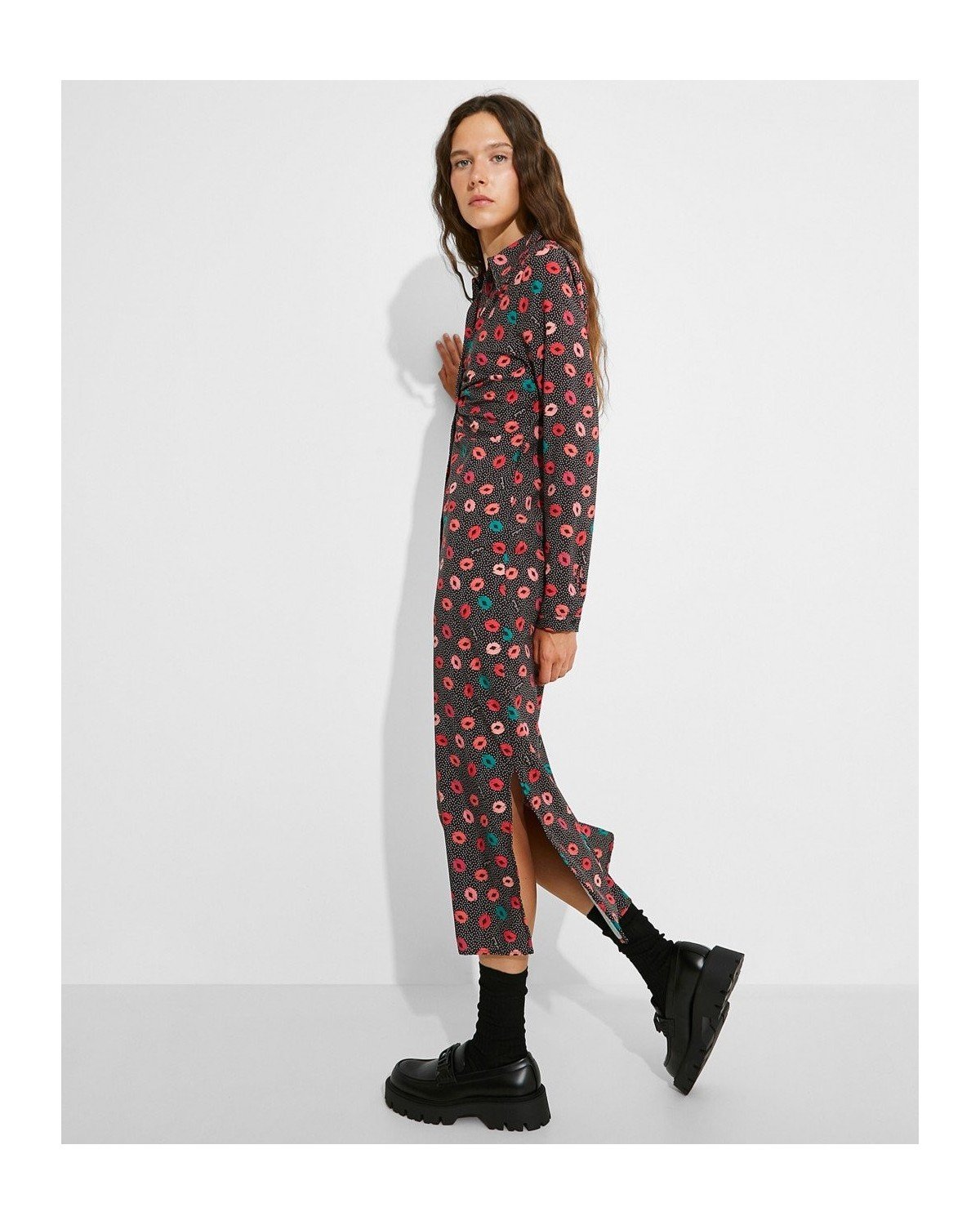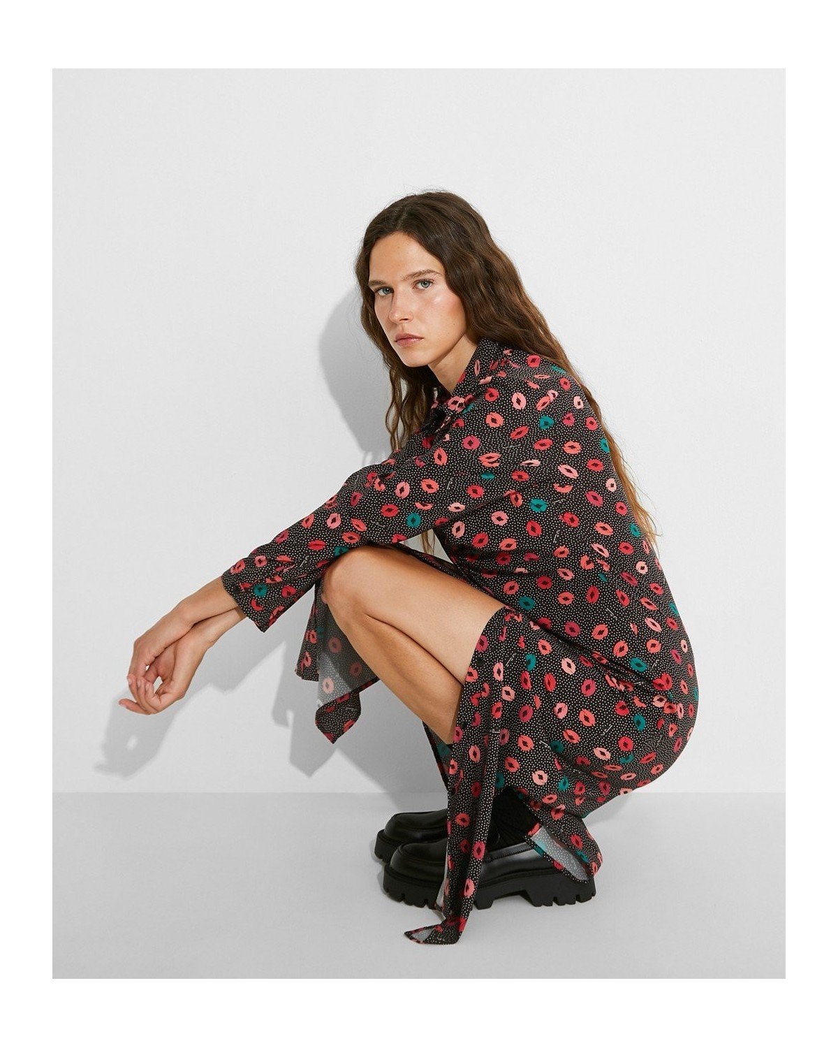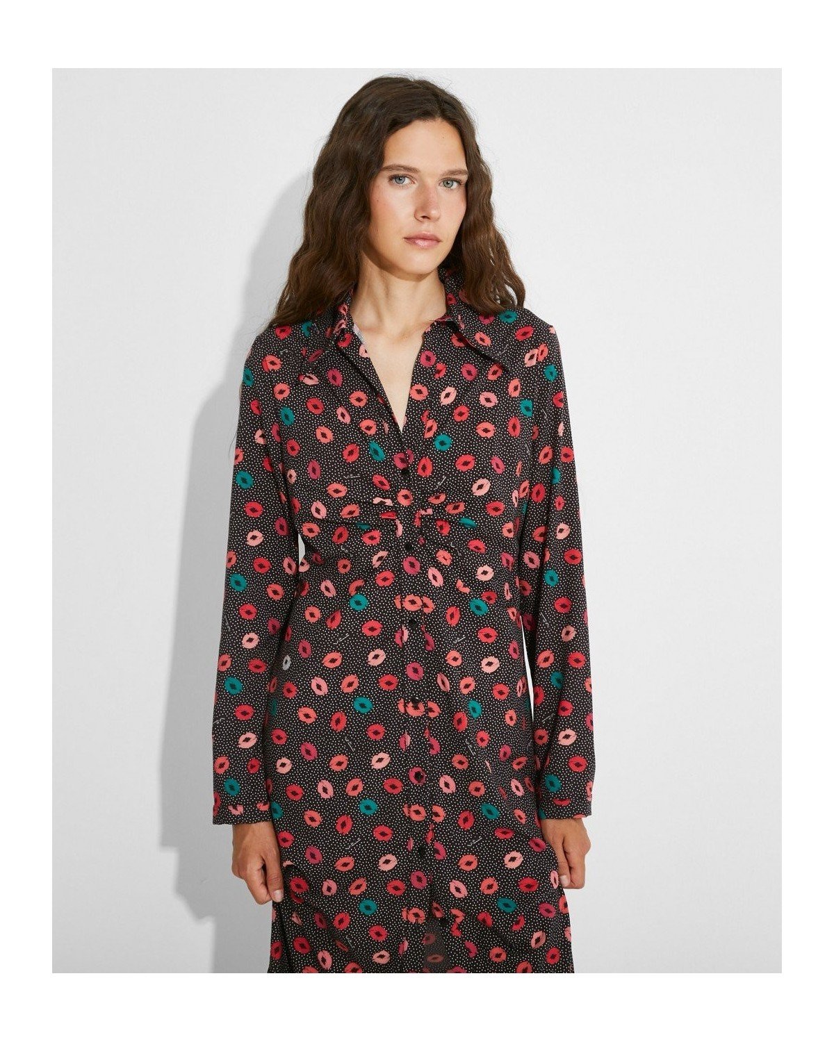 Vestido midi estilo camisero con estampado de besos. Cuello solapa. Manga larga y fruncido en pecho