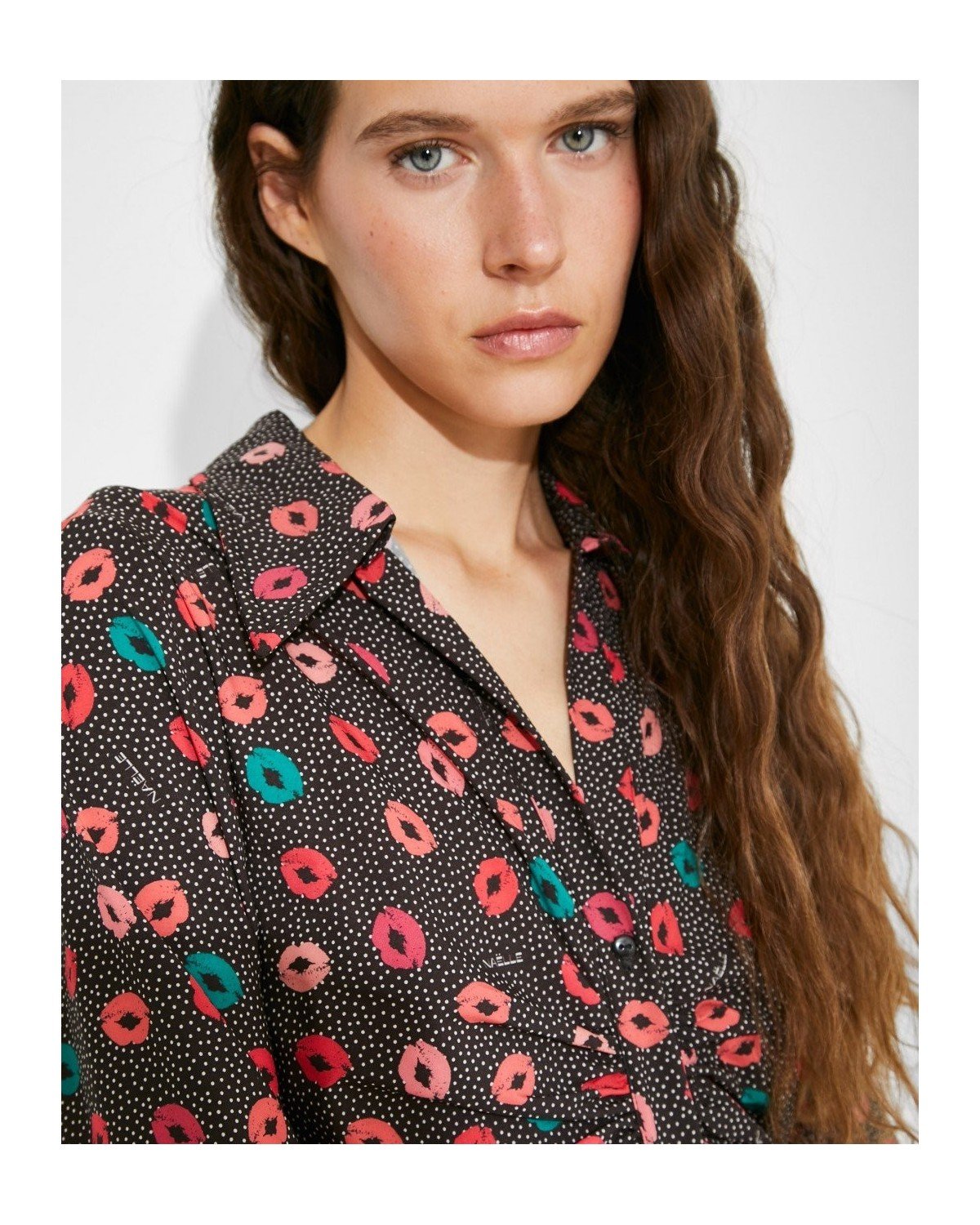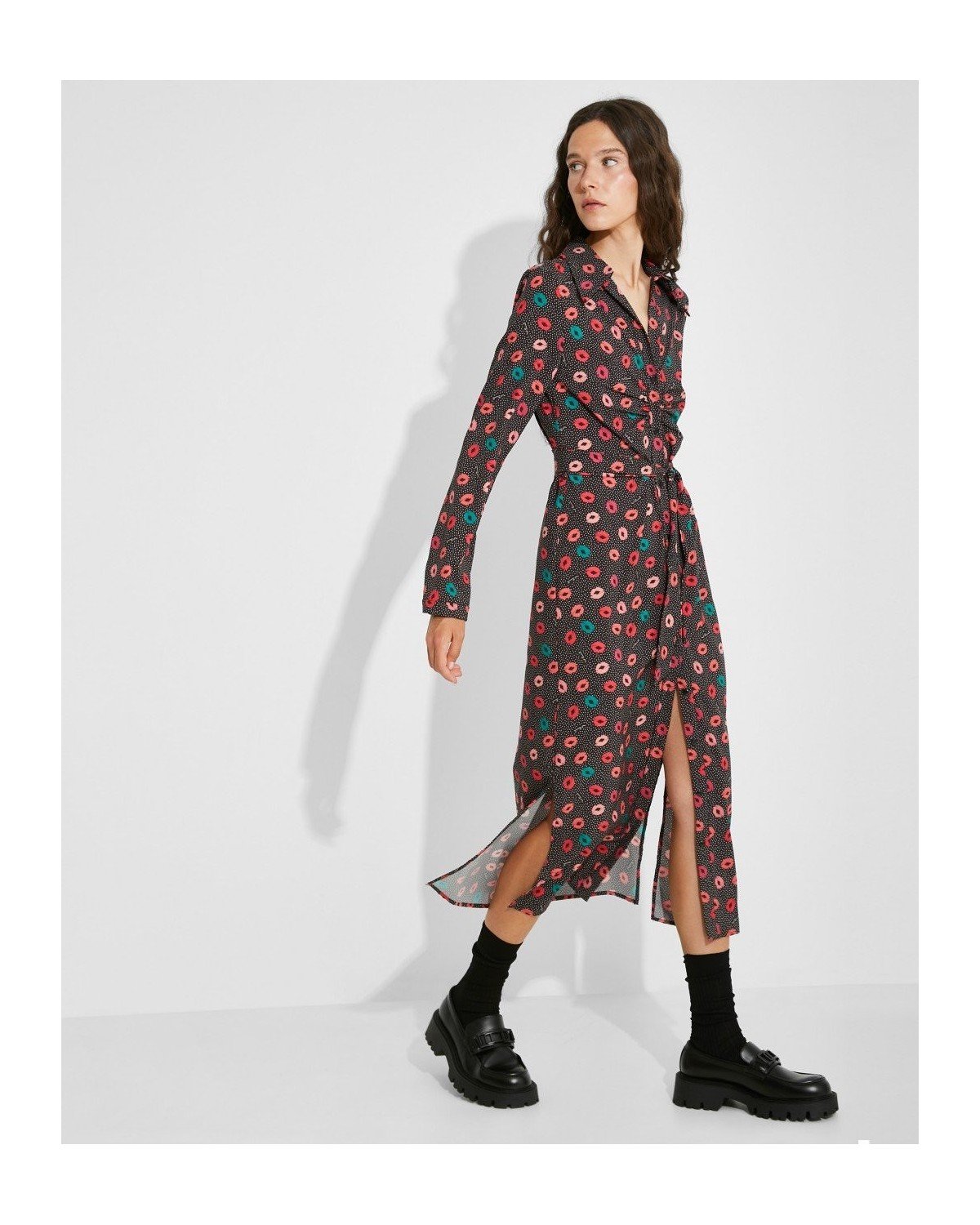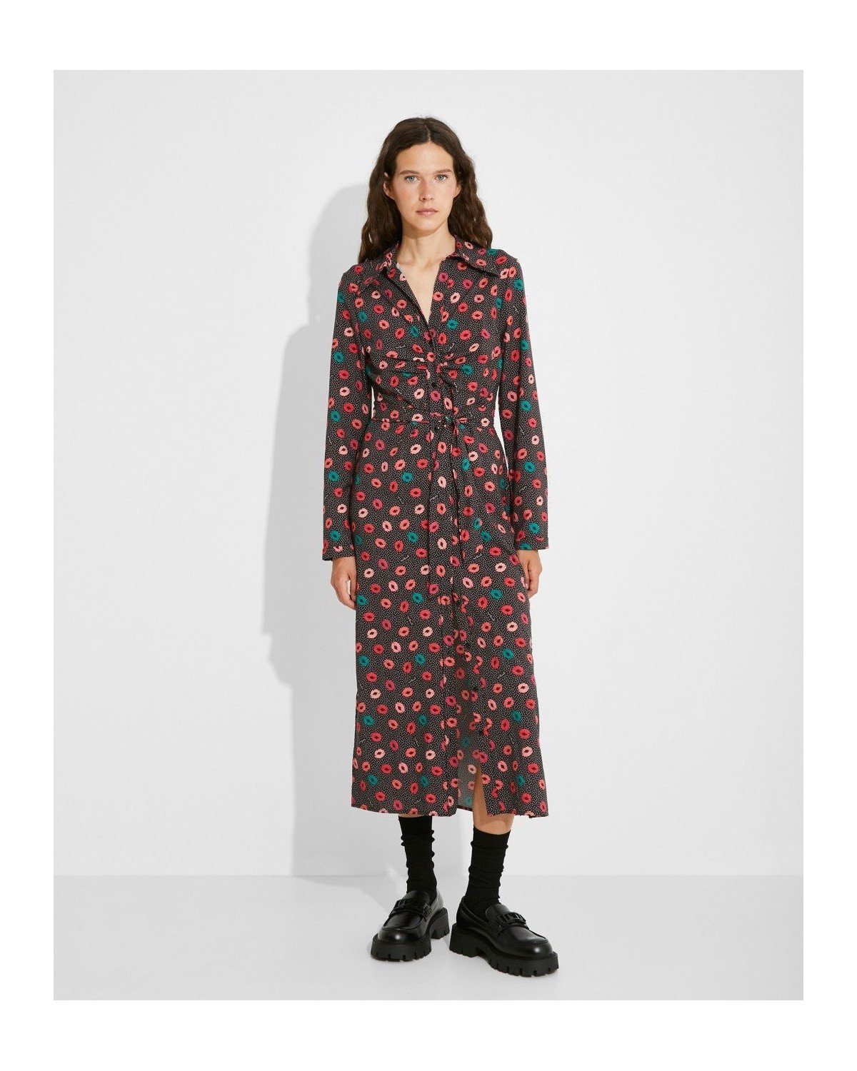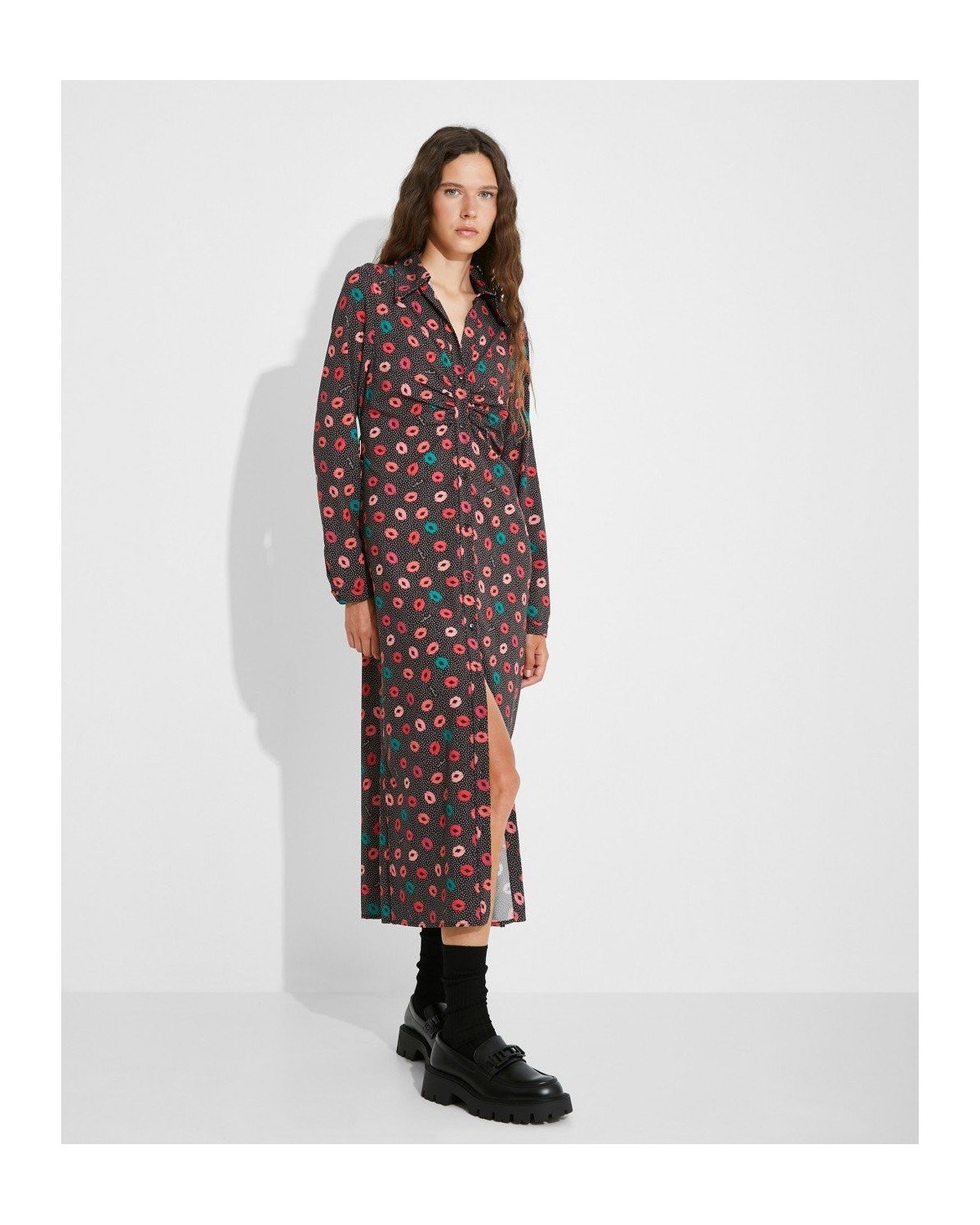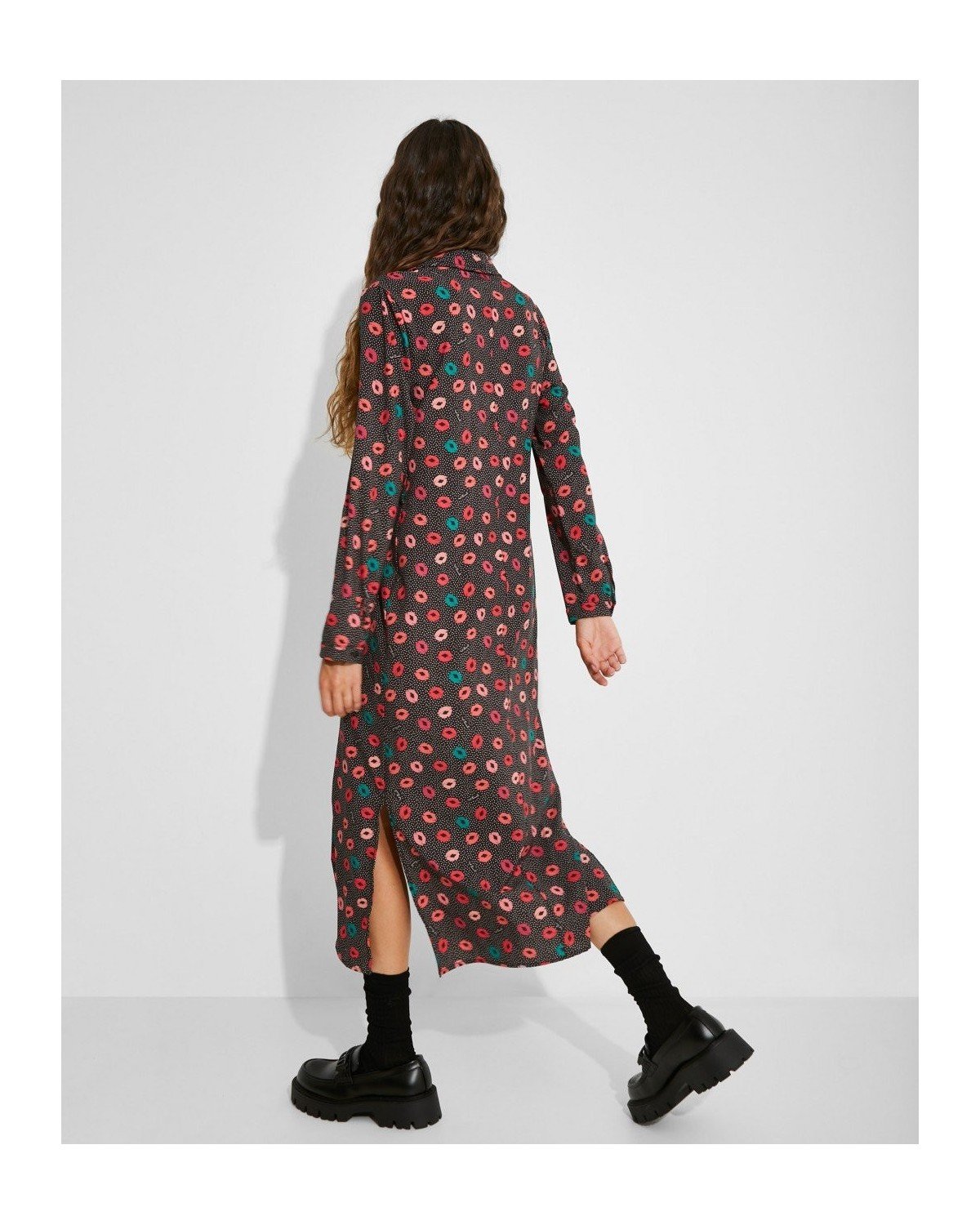 Vestido midi estilo camisero con estampado de besos. Cuello solapa. Manga larga y fruncido en pecho