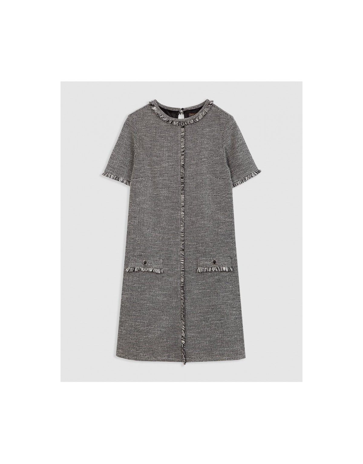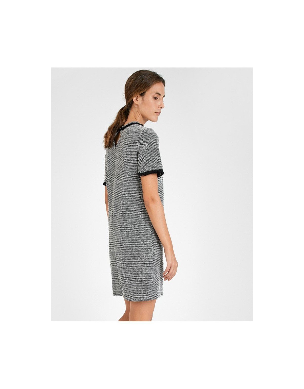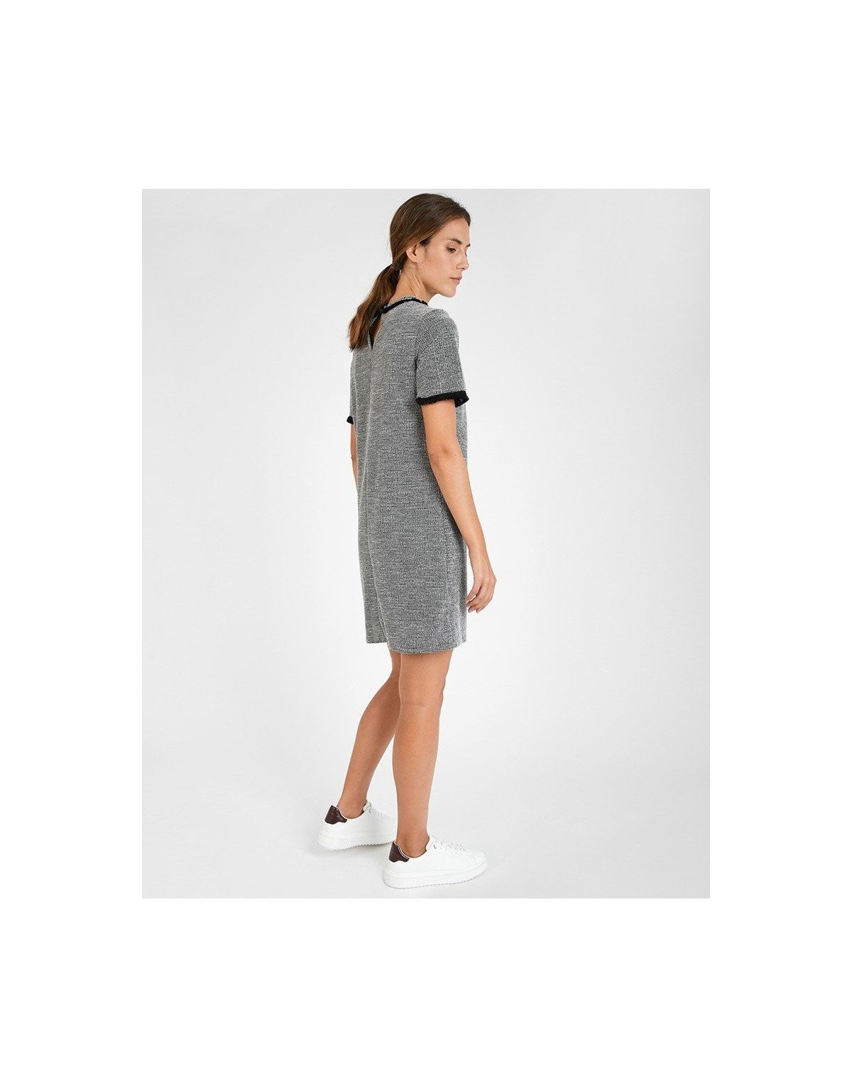 Vestido de punto cortado, cuello de caja, vivos desflecados y falso bolsillo