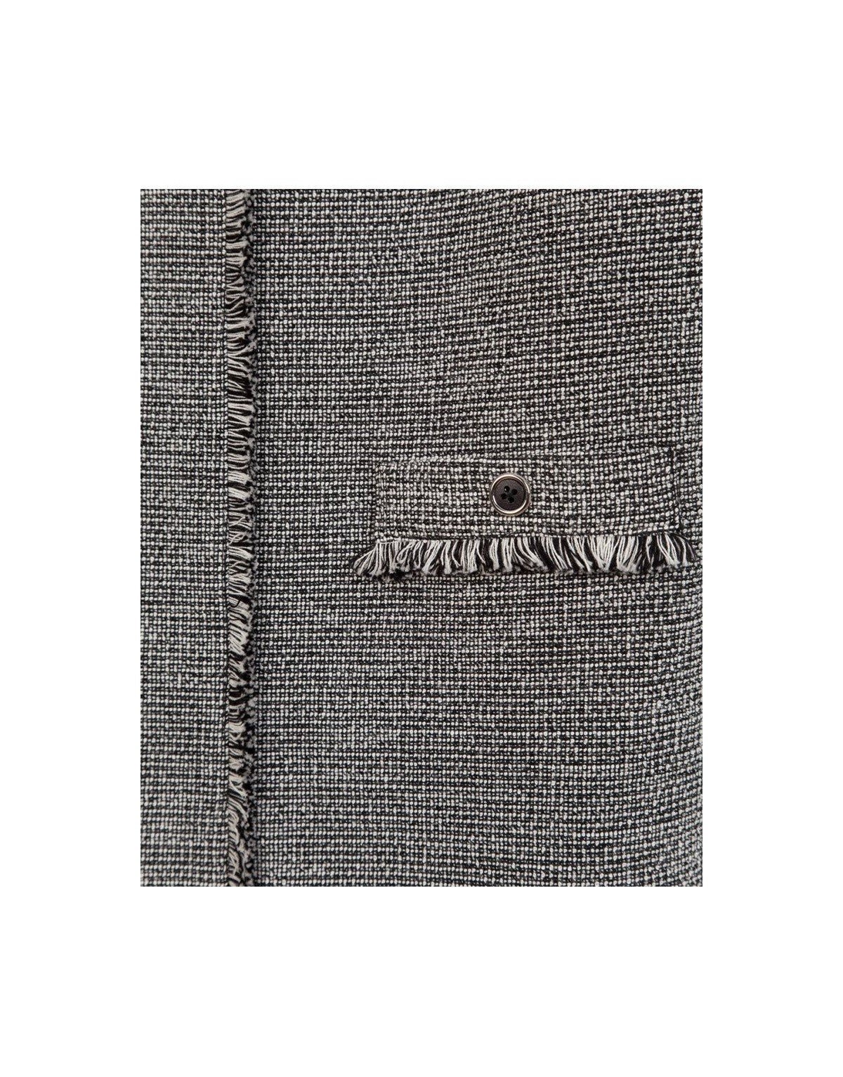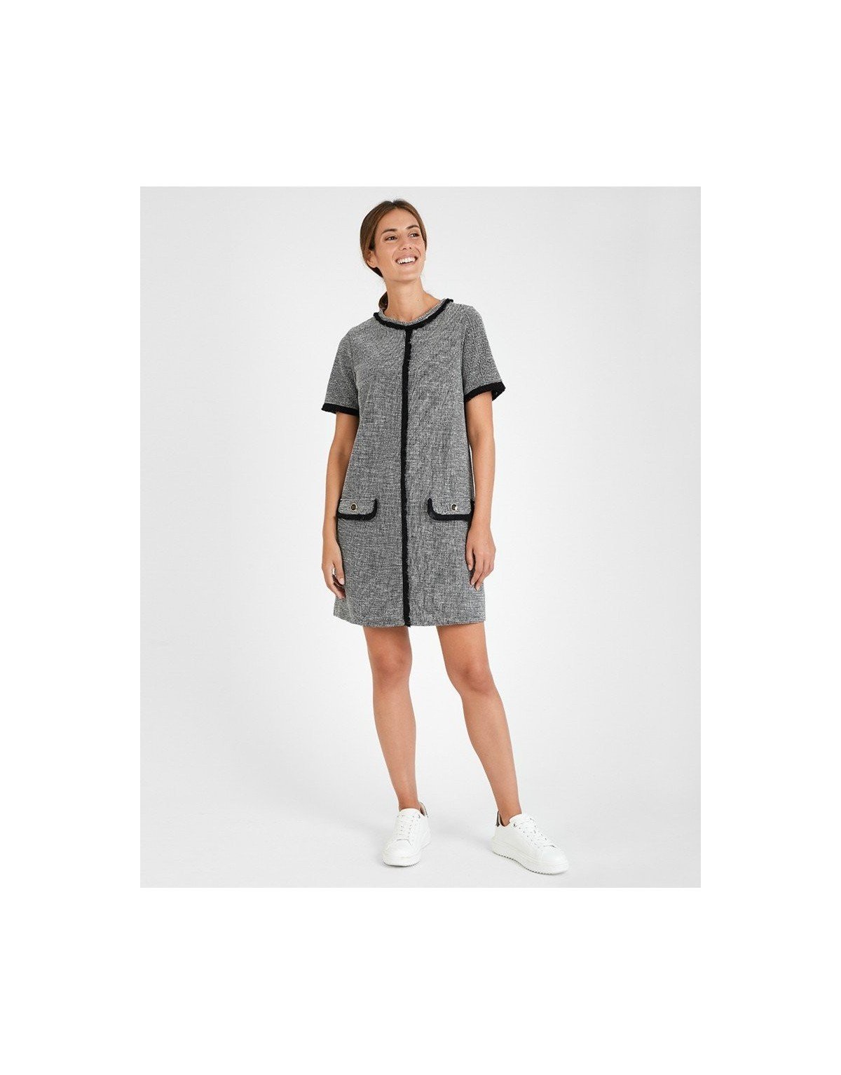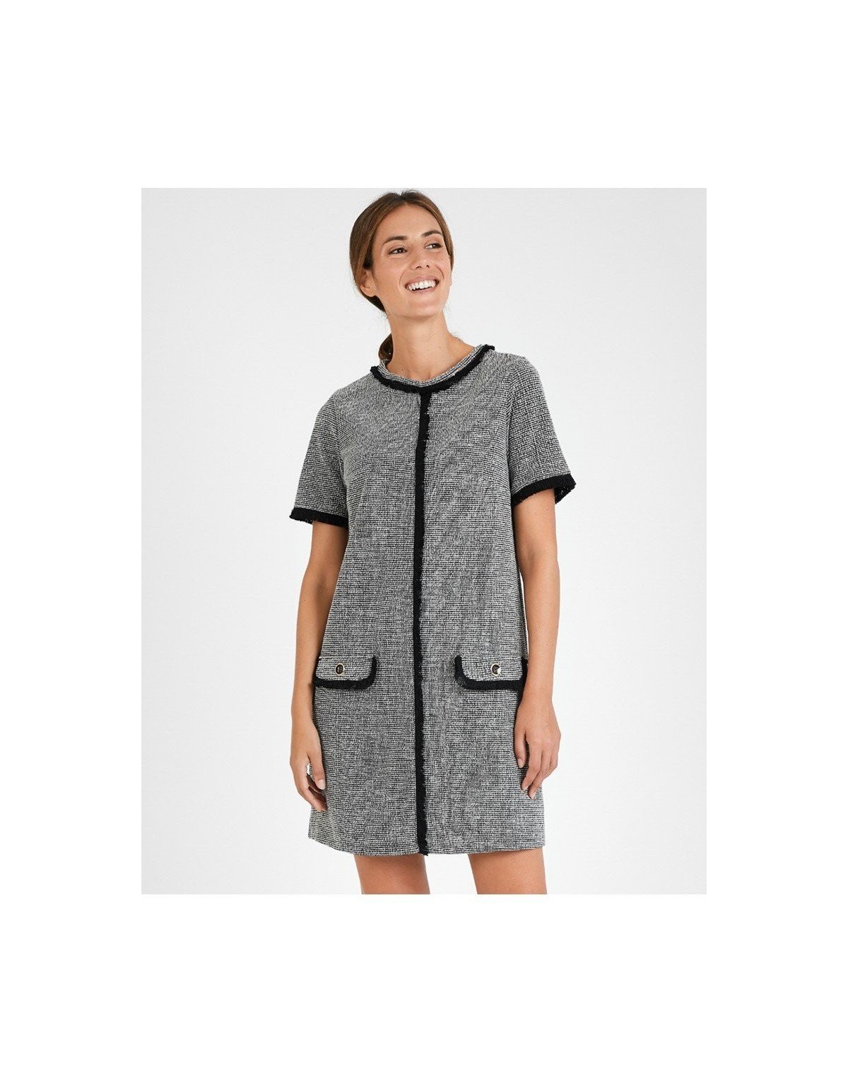 Vestido de punto cortado, cuello de caja, vivos desflecados y falso bolsillo