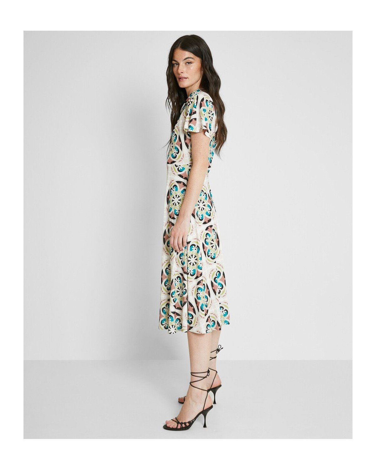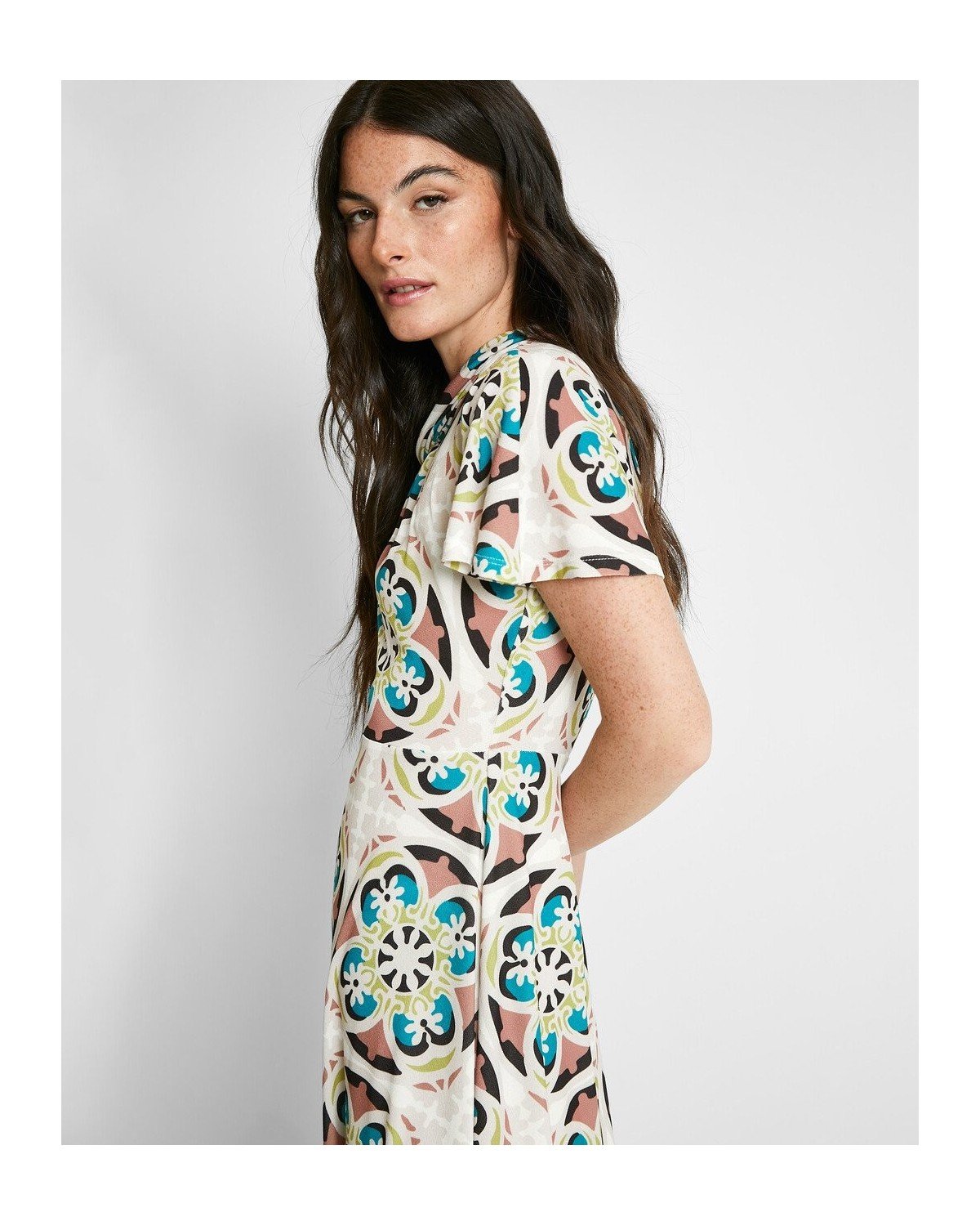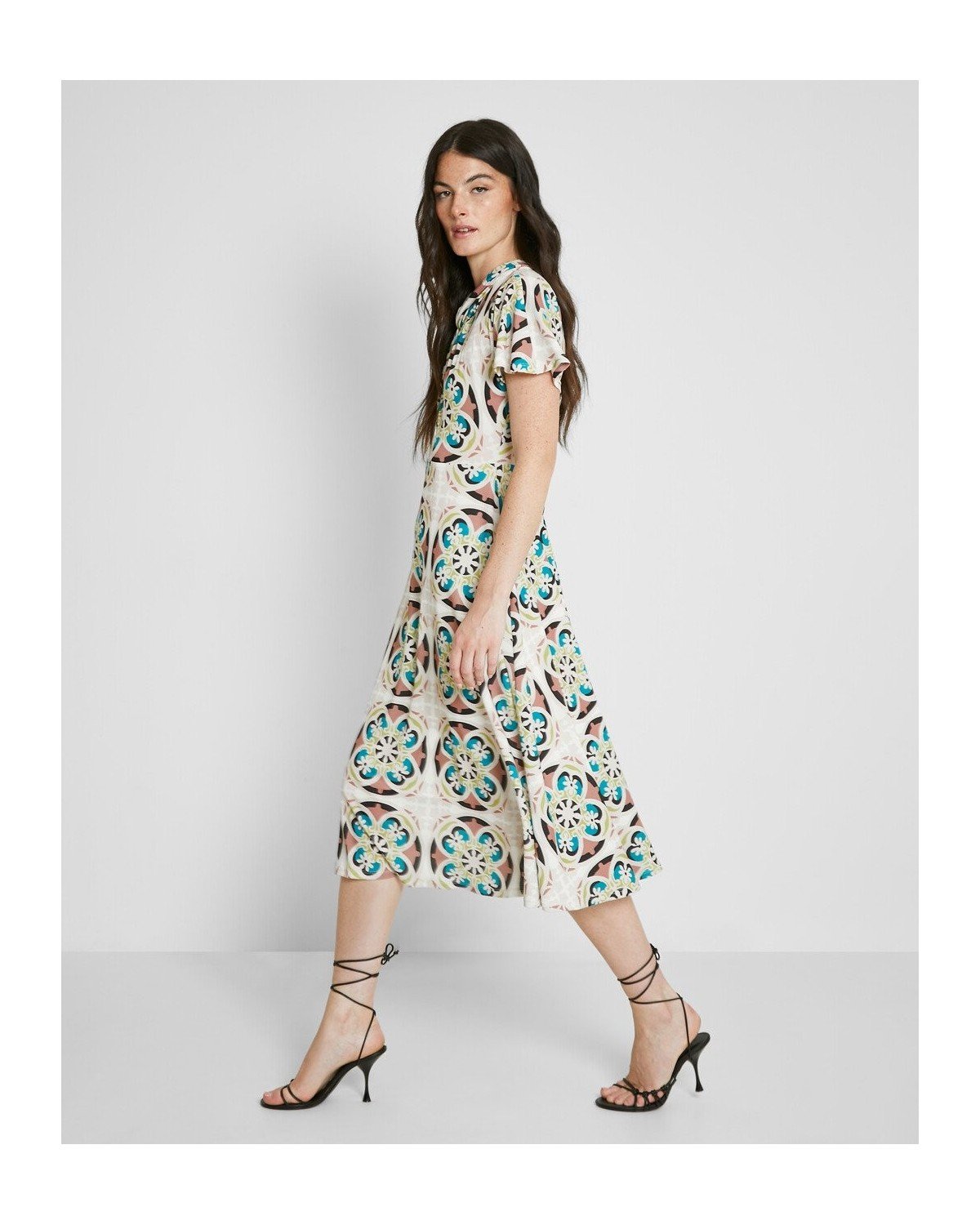 Vestido midi estampado de cuello perkins con abertura y manga corta