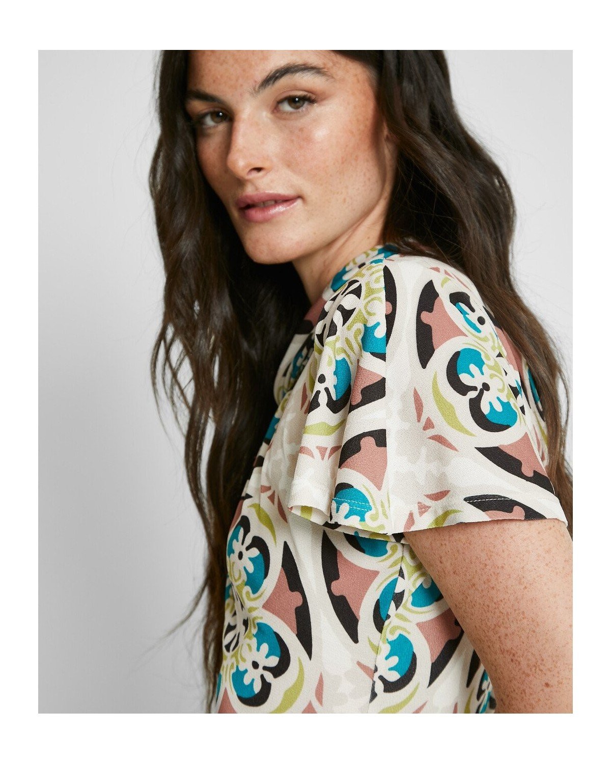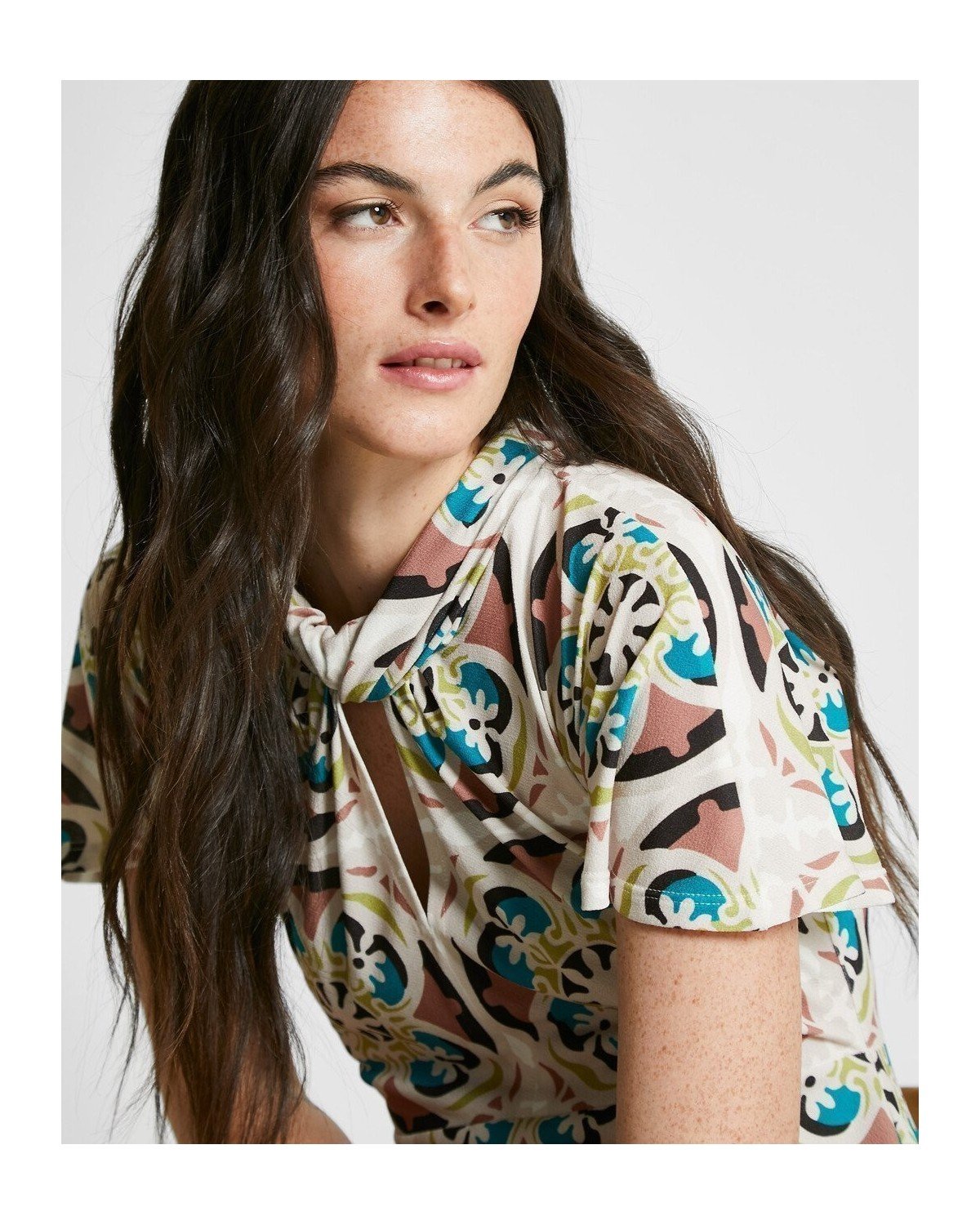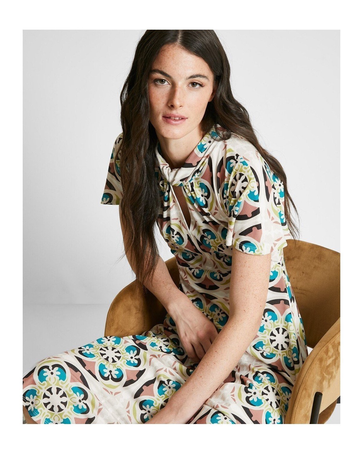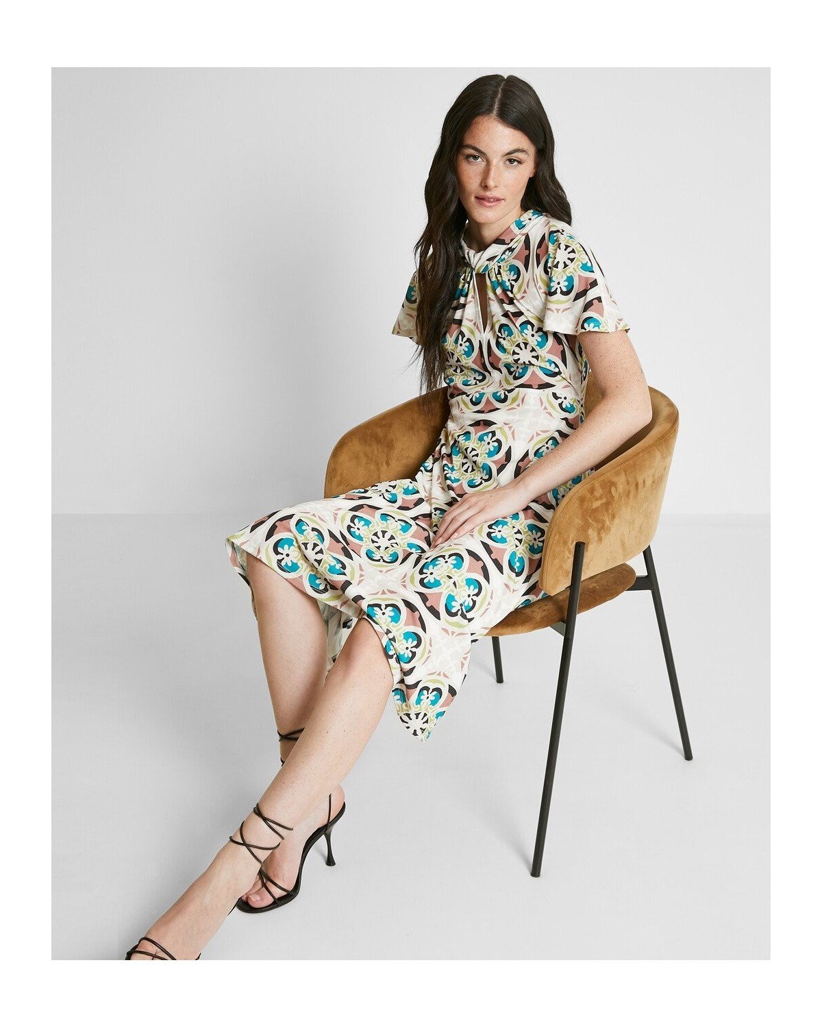 Vestido midi estampado de cuello perkins con abertura y manga corta